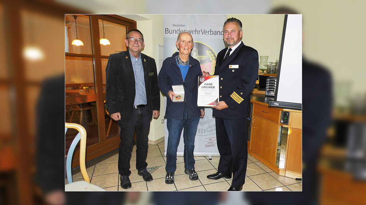 Nach der Ehrung für 20 Jahre Mandatstätigkeit: Bezirksvorsitzender Harald Lott (v.l.), der Geehrte, Stabsfeldwebel d.R. Joachim Wiese, und Vorsitzender Marine, Fregattenkapitän Marco Thiele. Foto: Arved Fritze