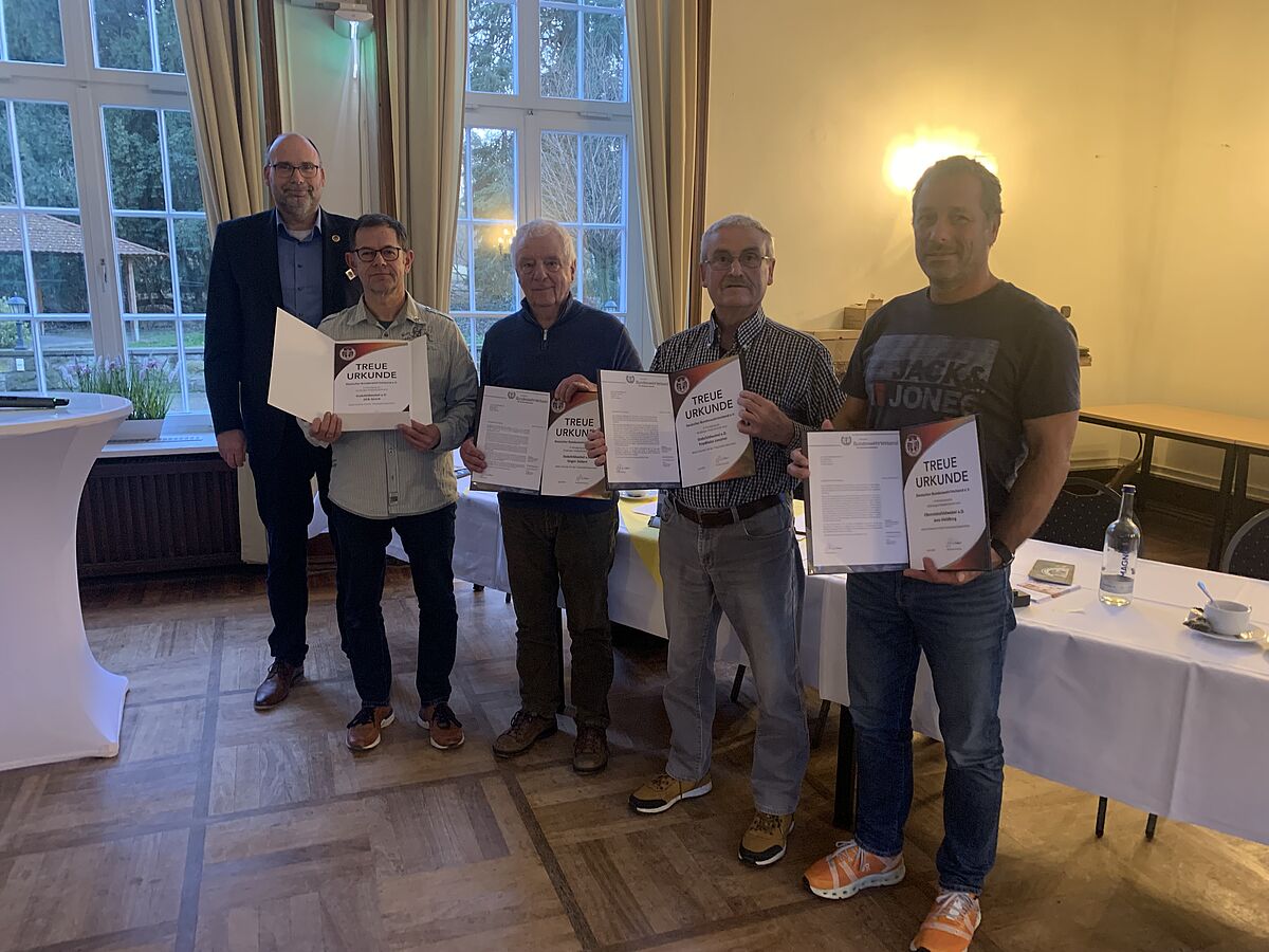Lüneburg. Die Lüneburger Ehemaligen haben ihren alten Vorstand wiedergewählt. Vorsitzender bleibt Stabsfeldwebel a.D. Dirk Jersch, Stellvertreter Hauptmann a.D. Michael Scholz, Schriftführer Oberstabsfeldwebel a.D. Udo Palußek, Kassenwart Oberstabsfeldwebel Torsten Dittmer. Anschließend wurden Stabsfeldwebel a.D. Jürgen Siebert für 50 Jahre sowie Stabsfeldwebel a.D. Friedhelm Liesener und Oberstabsfeldwebel a.D. Jens Holdberg für 40 Jahre Mitgliedschaft geehrt. Durch den Vorsitzenden ERH im Landesverband Nord Hauptmann a.D. Michael Scholz wurde auch der alte und neue Vorsitzende Jersch für vier Jahrzehnte im DBwV ausgezeichnet.