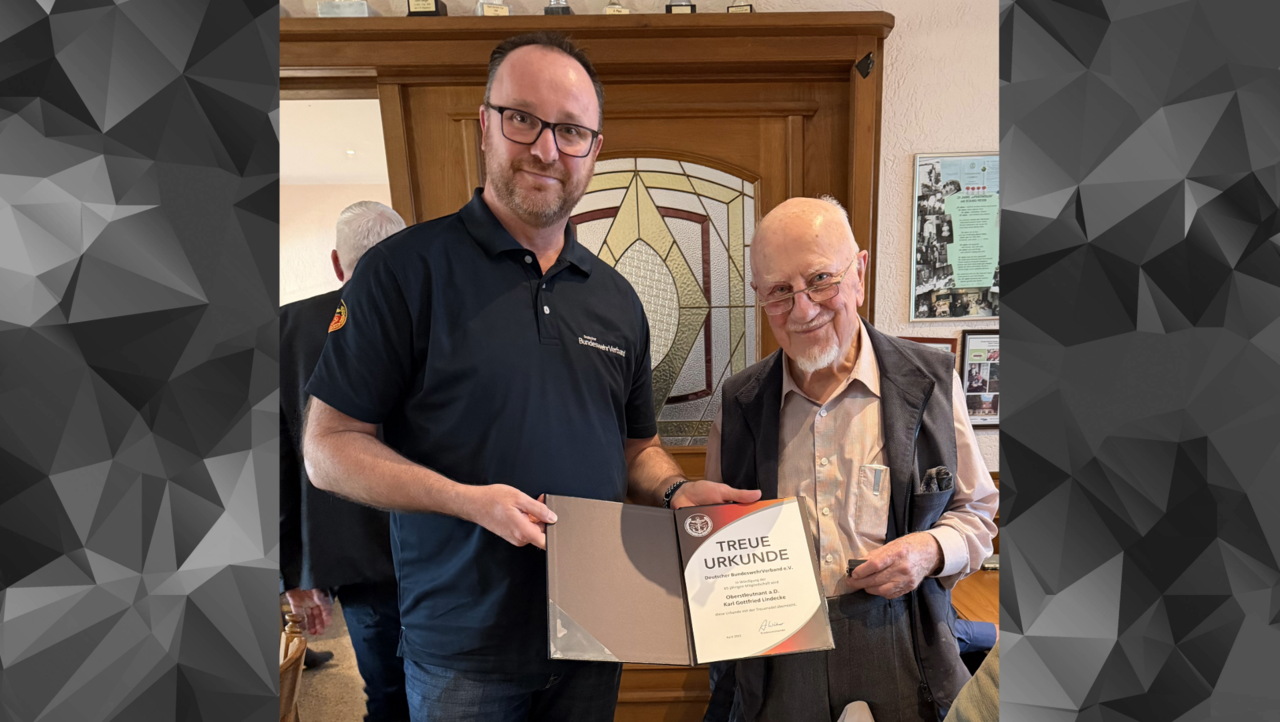 Langanhaltender Applaus war das eindeutige Zeichen, dass eine Ehrung für 65 Jahre Mitgliedschaft im Deutschen BundeswehrVerband (DBwV) ein nicht alltäglicher Akt ist. Dies brachte der Vorsitzende des Bezirks Sachsen-Anhalt, Stabsfeldwebel Tino Nicolai, in seiner Laudatio auf den zu Ehrenden, Oberstleutnant a. D. Karl Gottfried Lindecke, dann auch deutlich zum Ausdruck. Seien Ehrungen für ihn immer ein Anlass, den Auszuzeichnenden für Treue und Verbundenheit zu danken, gelte dies bei einem solchen Jubiläum umso mehr. So sei Karl Gottfried Lindecke in seiner Zeit Verbandsmitglied geworden, in der das nicht unbedingt selbstverständlich war und auch nicht nur auf Zustimmung stieß. Dass er dem DBwV dann über mehr als 65 Jahre die Treue gehalten habe, zeige deutlich, dass der Verband, wisse worauf es ankommt und was die Wünsche seiner Mitglieder sind, die dann in die verbandlichen Forderungen gegenüber der Politik einfließen können.