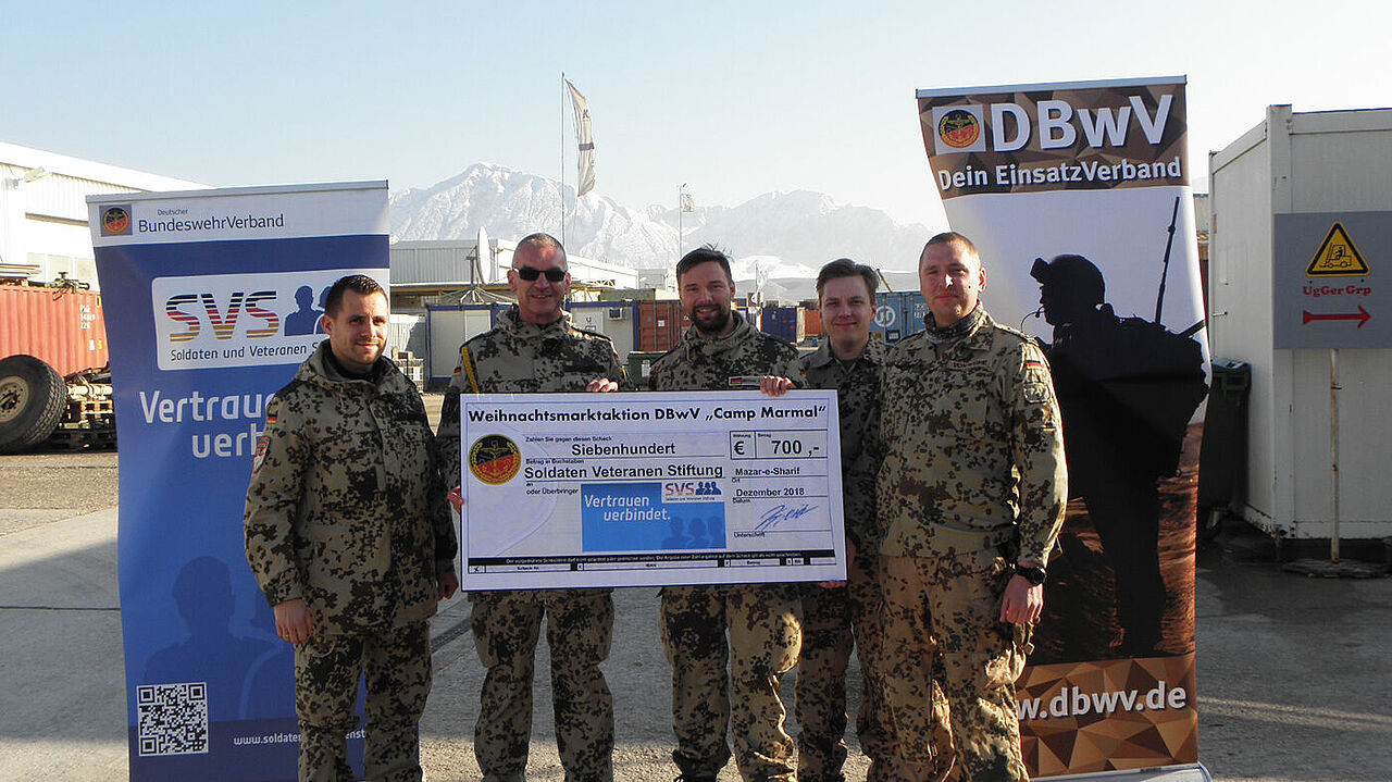 Masar-e-Sharif. Auf dem Weihnachtsmarkt im Camp Marmal in Masar-e-Sharif war am 17. Dezember der Stand des Deutschen BundeswehrVerbands mit Glücksrad ein großer Besuchermagnet. Nicht nur die Ministerin hatte am Glücksrad gedreht und einen Kugelschreiber des DBwV mit nach Hause nehmen dürfen – gefühlt haben 500 bis 600 Soldaten den Stand besucht. Der Dreh am Glücksrad war mit einer freiwilligen Spende für die Soldaten und Veteranen Stiftung verbunden. Hierbei wurde die beachtliche Summe von 700 Euro erzielt. Die neuen schwarzen Tassen des DBwV waren dabei der Ansporn für den Dreh am Glücksrad. Der Beitrag wurde später sogar noch auf 765 Euro erhöht.