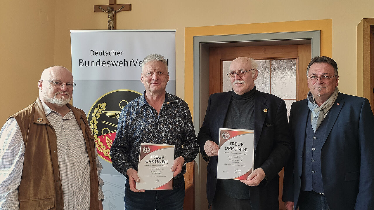Die Kameradschaft ERH Memmingen hat zwei langjährige Mitglieder für ihre Treue zum Deutschen BundeswehrVerband bei einer Vorstandssitzung ausgezeichnet. Oberstleutnant a.D. Klaus Mai erhielt die Treuenadel und -urkunde für 50 Jahre Mitgliedschaft, Hauptmann a.D. Reinhold Steffen für 40 Jahre. Beide lobten die Arbeit des Verbandes und des Kameradschaftsteams in Memmingen.