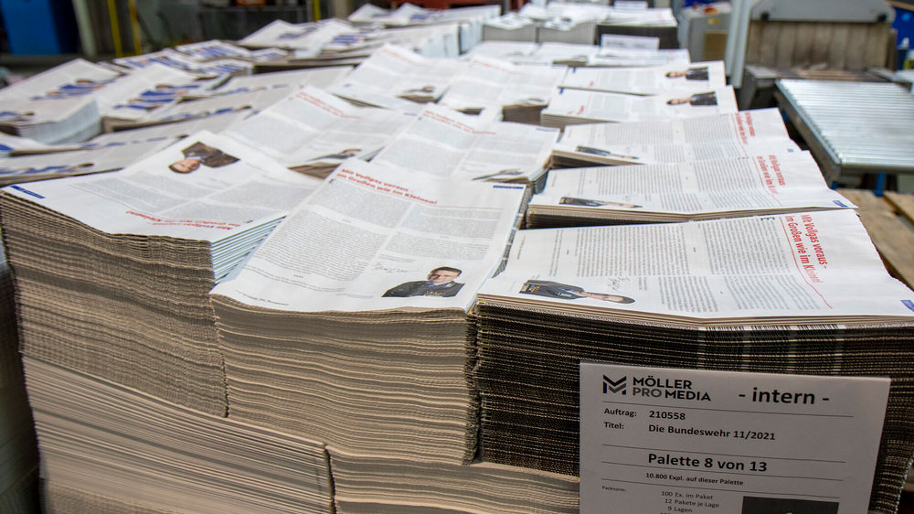 Zwölf Mal im Jahr verlassen gegen Monatsende rund 140 [Sixth space] 000 Ausgaben von „Die Bundeswehr“ die Druckerei von Möller Pro Media. Hier in Ahrensfelde bei Berlin lässt der DBwV sein Verbandsmagazin drucken. Komplexe Technik und eine regelmäßige Qualitätskontrolle durch das Personal sorgen dafür, dass unsere Leserinnen und Leser am Monatsbeginn ein hochwertiges Magazin in den Händen halten. Gabriela Körner, die das DBwV-Verbandsmagazin bei Möller Pro Media betreut, führte uns durch alle Schritte der Produktion.