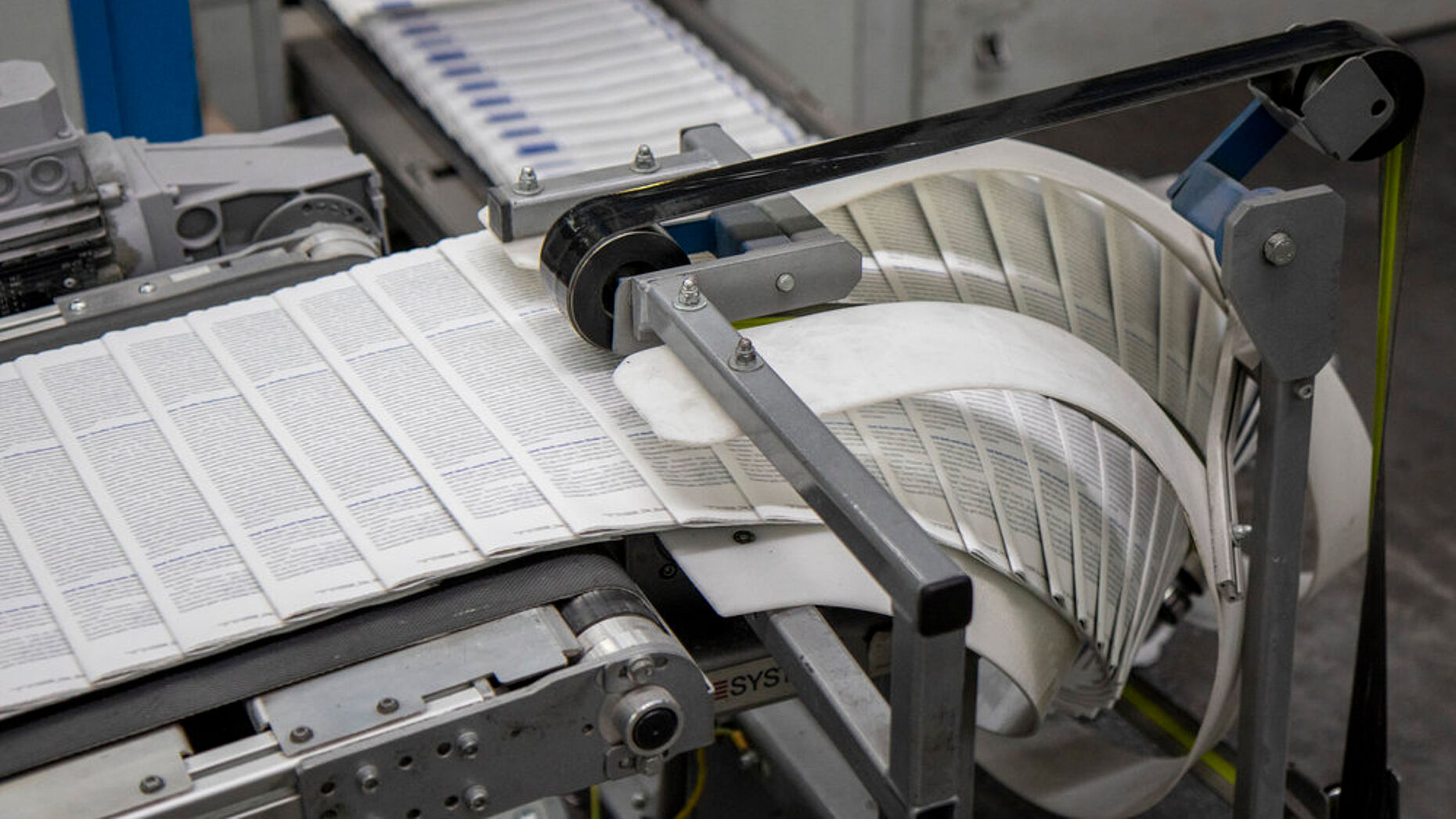 Beim Verlassen der Druckmaschine wird die Papierbahn in große Druckbögen geschnitten, von denen jeder 32 DIN-A4-Seiten des Magazins enthält. Einen Druckbogen, also 32 Seiten, in der Gesamtauflage des Magazins zu drucken, dauert gut vier Stunden. Der Vorgang wiederholt sich dann noch zwei weitere Male, dabei werden die anderen 64 Seiten gedruckt. Die automatisch in der korrekten Seitenreihung gefalzten Druckbögen kommen anschließend in großen Stapeln in die nächste Halle. Dort warten bereits die zuvor auf dem stärkeren Papier gedruckten Umschlagsseiten. Es ist nun bereits Montagabend.