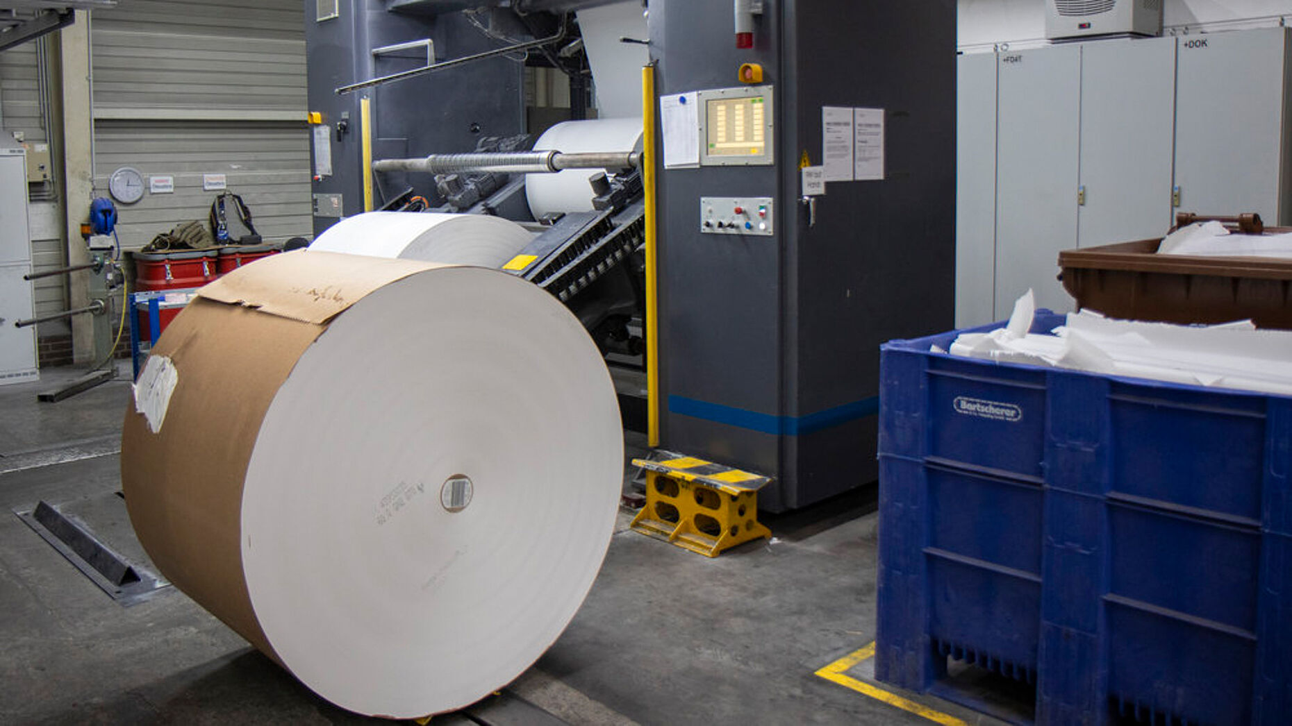 Nun kann der eigentliche Druckprozess beginnen. Dazu steht bereits die erste Rolle Papier bereit, ganze 1,2 Tonnen schwer. Die Produktion des November-Magazins mit 96 Innenseiten wird etwa 30 dieser riesigen Rollen Papier mit einer Papierstärke von 60 g/m2 verschlingen. Für den Umschlag des Magazins, der auf dickerem Papier gedruckt wird, werden drei Rollen Papier mit einer Papierstärke von 150 g/m2 benötigt.