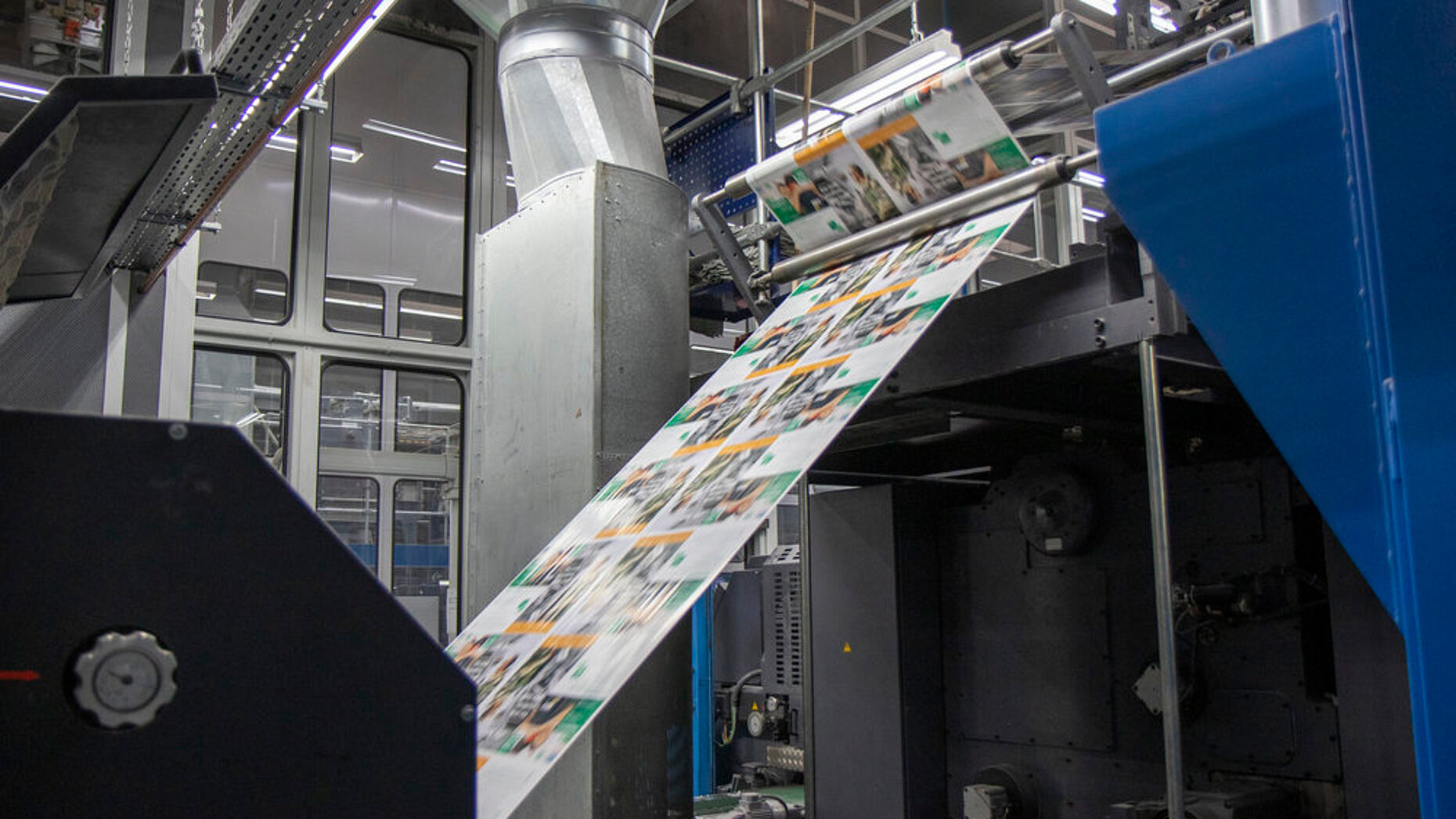 Die Druckplatte und das Papier kommen dabei nicht direkt miteinander in Berührung, so wird die Druckplatte geschont. Zunächst durchläuft die Papierbahn das Druckwerk mit der schwarzen Farbe, hier wird beispielsweise die schwarze Schrift auf das Papier gedruckt. Es folgen die Druckwerke für die Farben Cyan (Blau), Magenta (Rot) und Gelb. „Nur wenn diese Farben exakt übereinander gedruckt werden, ergibt sich ein klares Druckbild“, erläutert Gabriela Körner. „Ansonsten würde es zu einem unscharfen Text mit Farbverschiebungen und zu verschwommenen Bildern kommen.“ Das genaue Übereinanderpassen der Farben wird ständig elektronisch und manuell kontrolliert. Nach dem letzten gelben Druckwerk durchläuft die Papierbahn schließlich einen Trockner, der mit Temperaturen von bis zu 230 °C für eine schnelle Trocknung der Farben sorgt.