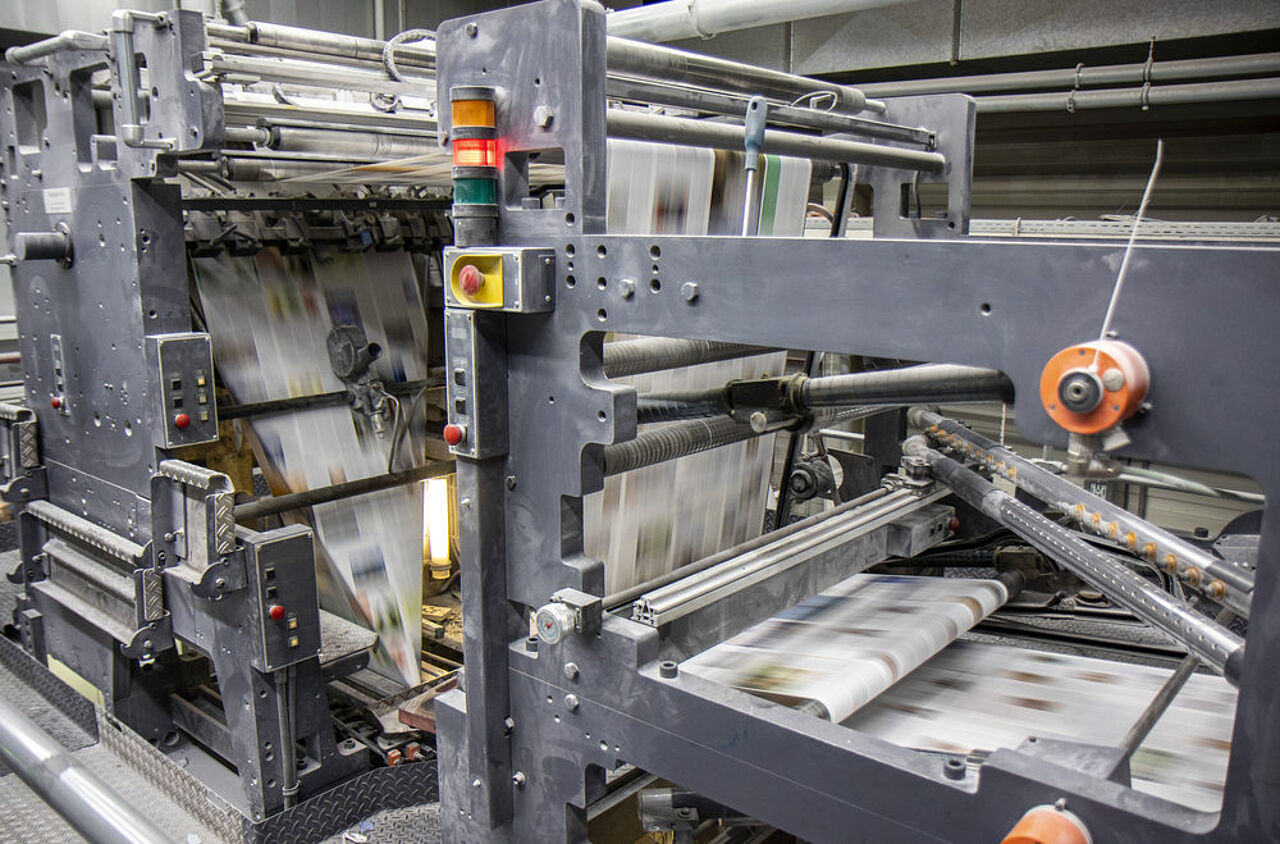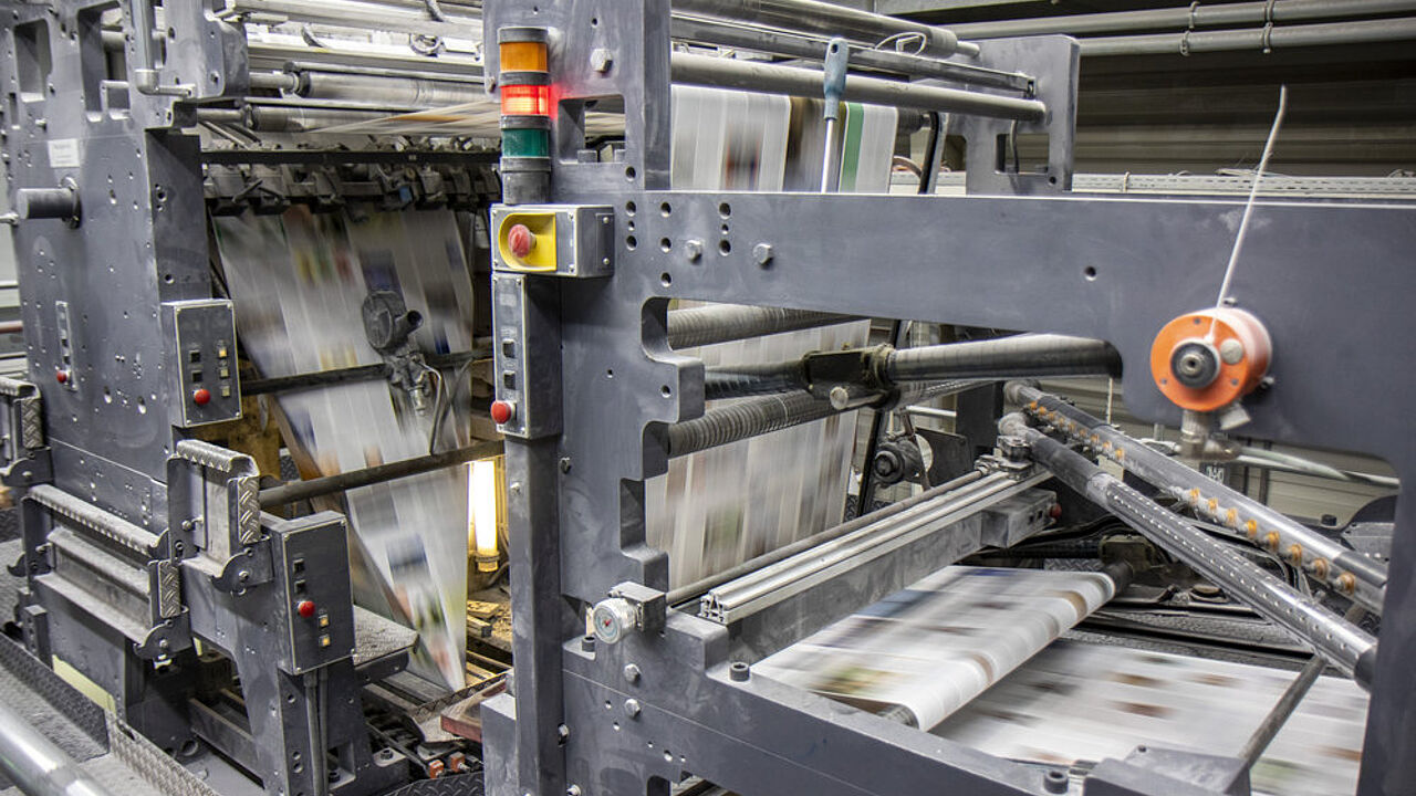In die Druckmaschine gezogen, rauscht die Papierbahn mit einer Geschwindigkeit von rund 50 km/h über die Walzen und Zylinder. Das macht ordentlich Lärm und Wind. Den Hinweis von Gabriela Körner auf die hohe Verletzungsgefahr glaubt man gern und hält als Besucher gebührenden Abstand. Gedruckt wird im Heatsetrollenoffset-Verfahren. Für Kenner und alle, die es werden wollen: Es handelt sich dabei um ein indirektes Verfahren, bei dem die Farbe erst auf einen Gummituchzylinder und dann auf das Papier übertragen wird.