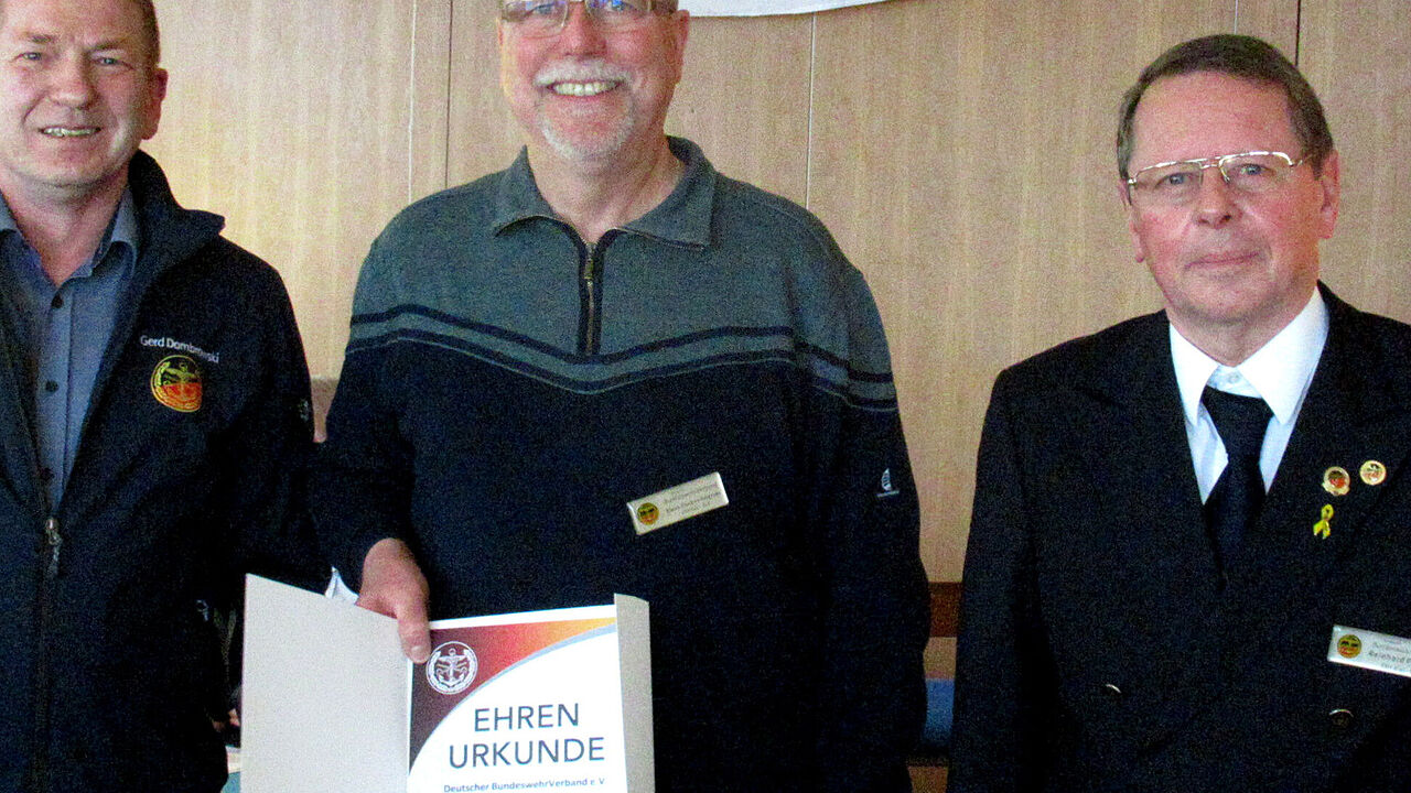 Der Geehrte, Kapitänleutnant a.D. Klaus-Thomas Petersen (Mitte), mit Obermaat der Reserve Reinhard Patzlaff (r.) und dem Stellvertretenden Landesvorsitzenden Nord, Stabsfeldwebel a.D. Gerd Dombrowski (l.). Foto: jf