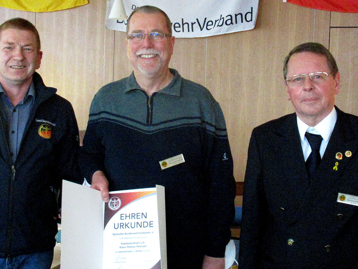 Kiel. Während der Mitgliederversammlung mit Vorstandswahlen der ERH Kiel-Süd wurde Kapitänleutnant a.D. Klaus-Thomas Petersen mit der Verdienstnadel des DBwV in Bronze ausgezeichnet. Die Ehrung nahm der Vorsitzende ERH Kiel-Süd, Obermaat der Reserve Reinhard Patzlaff, zusammen mit dem Stellvertretenden Landesvorsitzenden Nord, Stabsfeldwebel a.D. Gerd Dombrowski vor