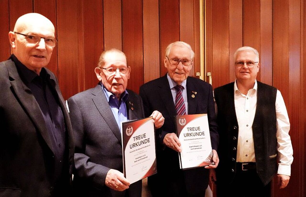 Rotenburg/Wümme. Eine Mitgliederversammlung der Kameradschaft der Ehemaligen, Reservisten und Hinterbliebenen (KERH) Rotenburg an der Wümme fand in Form eines Adventskaffeetrinken statt. Dazu trafen sich im Unterstedter „Restaurant Waldhof“ rund 40 Teilnehmer. Stabsfeldwebel a. D. / Oberstabsfeldwebel d. R. Uwe Stark ehrte im Rahmen der Veranstaltung zwei Kameraden: Hauptmann a.D. Sven von Ehrenkrook und Stabsfeldwebel a. D. Josef Lünnemann halten dem DBwV seit 60 Jahren die Treue.