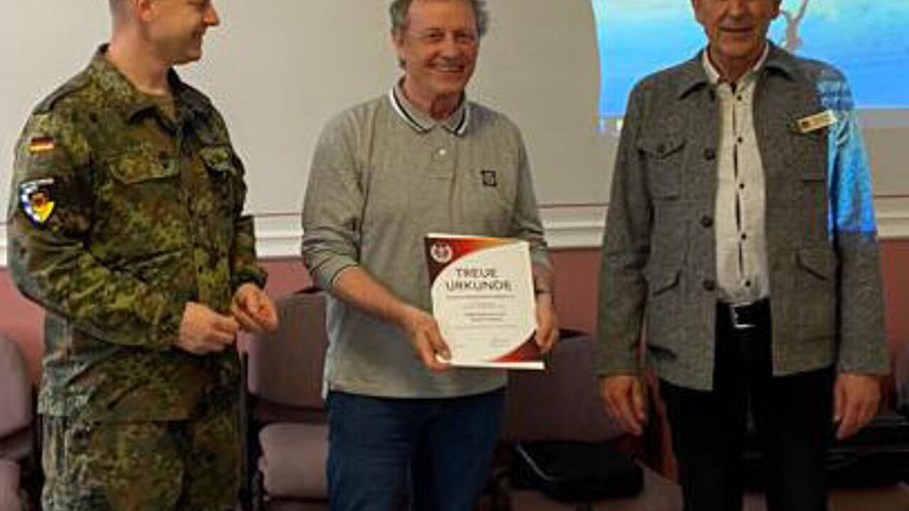 StoKa-Vorsitzender Hauptmann Steffen Klar überreicht Stabshauptmann a.D. Günther Schmitt gemeinsam mit Landesvorsitzendem Gerhard Stärk die Ehrung für 25-jährige Mitgliedschaft im DBwV. Foto: StoKa München