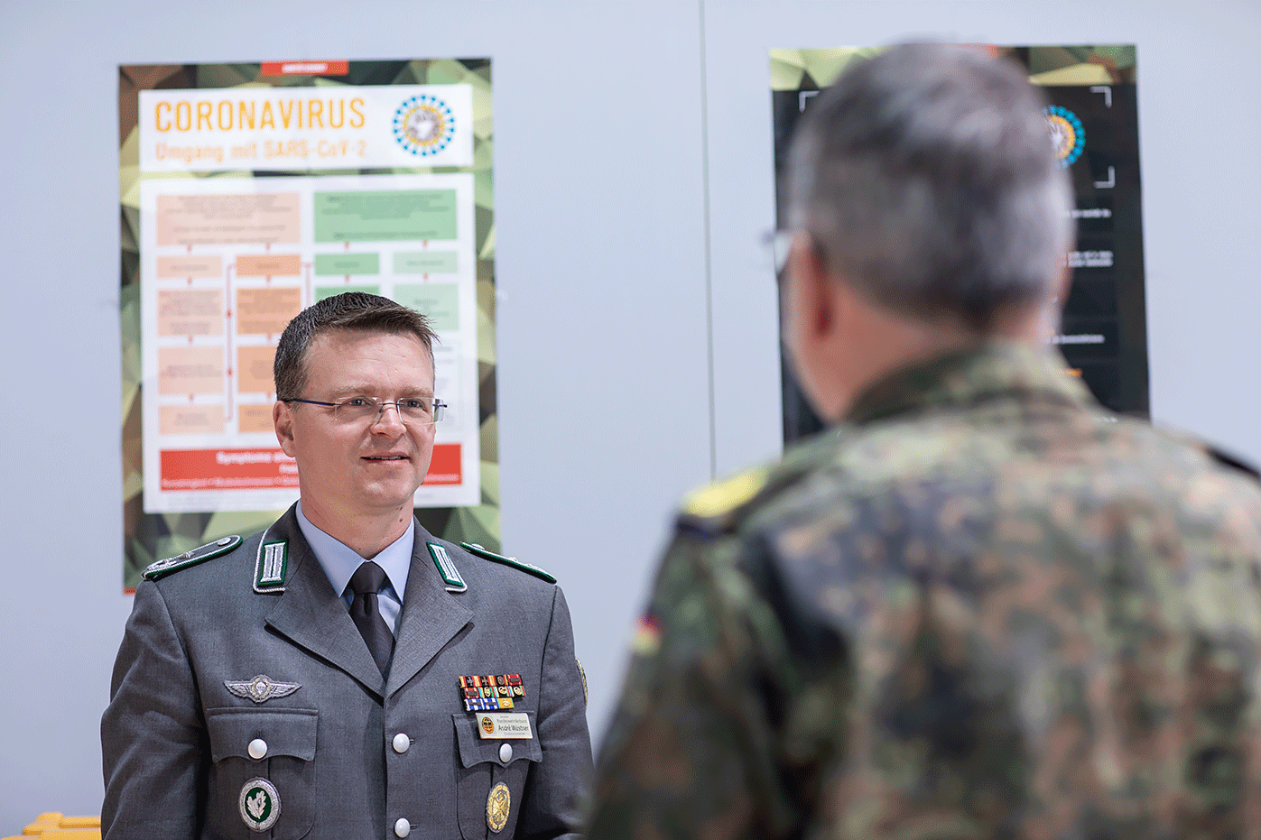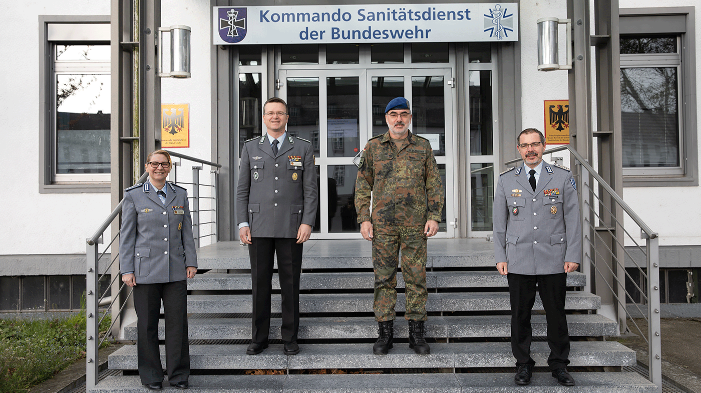Koblenz/Berlin. „Nahezu 100 Prozent des Sanitätsdienstes der Bundeswehr steht im Covid-19-Einsatz“ – die Worte des Inspekteurs Sanitätsdienst, Generaloberstabsarzt Dr. Ulrich Baumgärtner, verdeutlichen, welches Ausmaß die Ausbreitung des neuartigen Coronavirus mittlerweile angenommen hat. Aber auch das: Der Sanitätsdienst der Bundeswehr bewältigt zurzeit den wahrscheinlich größten Einsatz seiner Geschichte. So sind rund 8.000 Angehörige des Sanitätsdienstes in den Sanitätseinrichtungen in der Fläche aktiv, weitere 8.000 in den Bundeswehrkrankenhäusern. Das erfuhr Oberstleutnant André Wüstner bei seinem Treffen mit dem Inspekteur Sanitätsdienst in Koblenz. Begleitet wurde der DBwV-Bundesvorsitzende vom Vorstand Sanität im DBwV, Oberstabsfeldwebel Stefan Sprengers und Hauptmann Petra Böhm. Der Sanitätsdienst ist in einer Fülle von Maßnahmen gebunden. So sind allein 1.100 Menschen in den Laboren aktiv. In kürzester Zeit wurden neue Testverfahren eingeführt – die Zeit drängt, es geht darum, so viele Covid-19-Testergebnisse zu erhalten wie möglich. In den vergangenen Tagen hat der Sanitätsdienst mehr als 1.300 Betten in den Kasernen vorbereitet. Die Stuben mit Einzelnasszelle sind bei Bedarf für infizierte Soldaten vorgesehen, die einen leichteren Krankheitsverlauf aufweisen und sich nicht selbst versorgen oder durch Angehörige versorgt werden können. Sie werden isoliert behandelt und durch die örtlichen Sanitätseinrichtungen betreut.