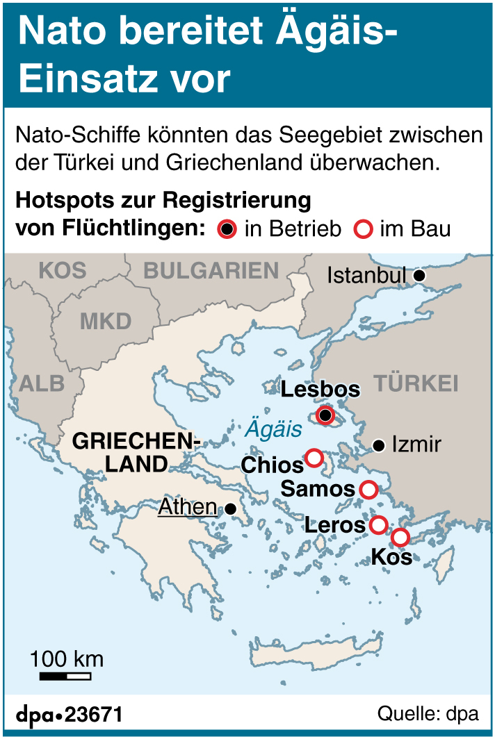 Nach Angaben aus Nato-Kreisen könnte der für den Einsatz vorgesehene Bündnisverband sofort in die Ägäis verlegt werden. Die Schiffe seien lediglich zwei bis drei Tage von der Ägäis entfernt, hieß es. Der Verband besteht derzeit aus fünf Schiffen und soll im Idealfall für den Einsatz gegen Schleuser auf etwa zehn Schiffe aufgestockt werden. Dänemark sagte Angaben aus Diplomatenkreisen zufolge noch am Mittwochabend spontan ein zusätzliches Schiff für den Verband zu.