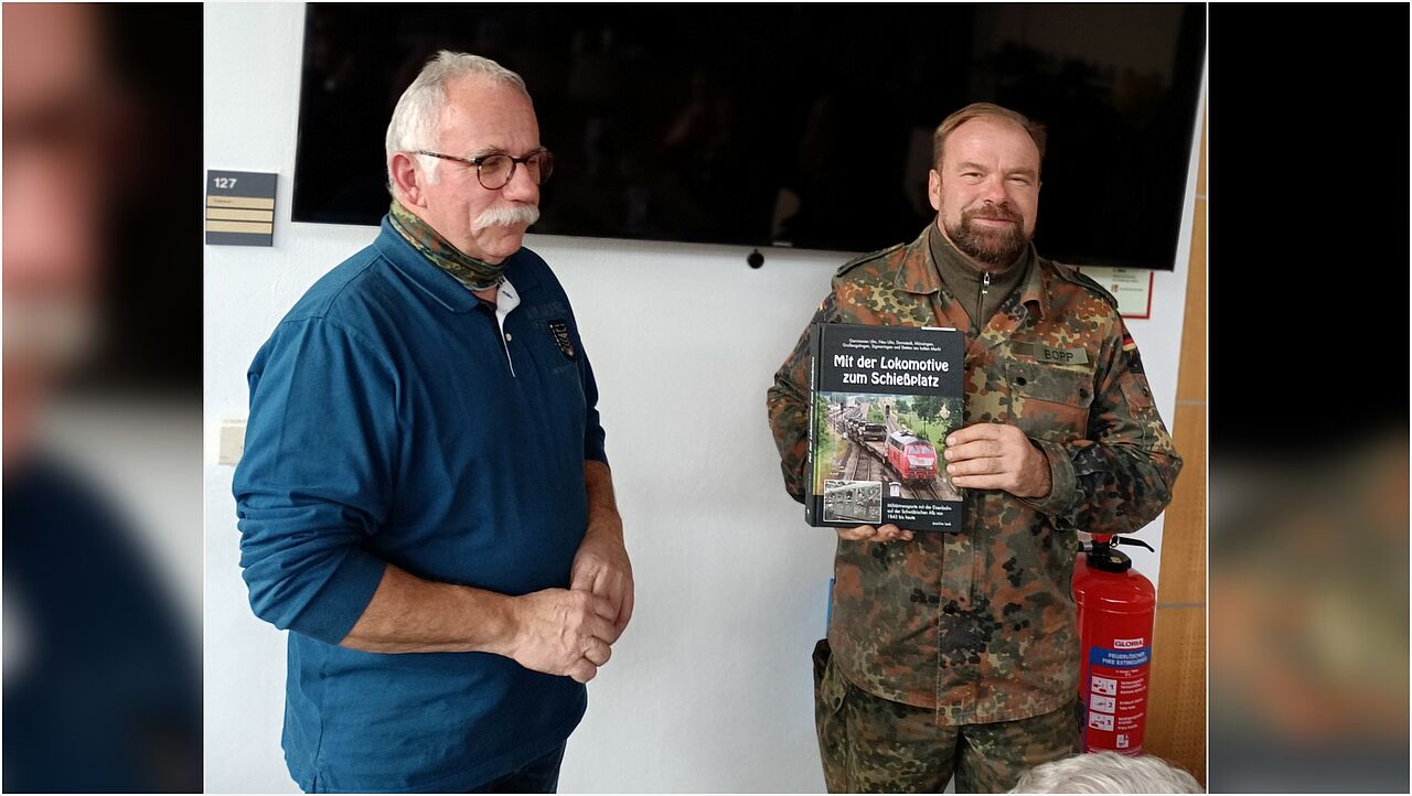 Vorsitzender der KERH Neckarzimmern, Oberstabsfeldwebel a.D. Jürgen Zechner (l.), wird vom Bezirksvorsitzenden Oberstabsfeldwebel Gerd-Josef Bopp für seinen jahrelangen Einsatz im DBwV geehrt. Foto: Friedbert Großkopf