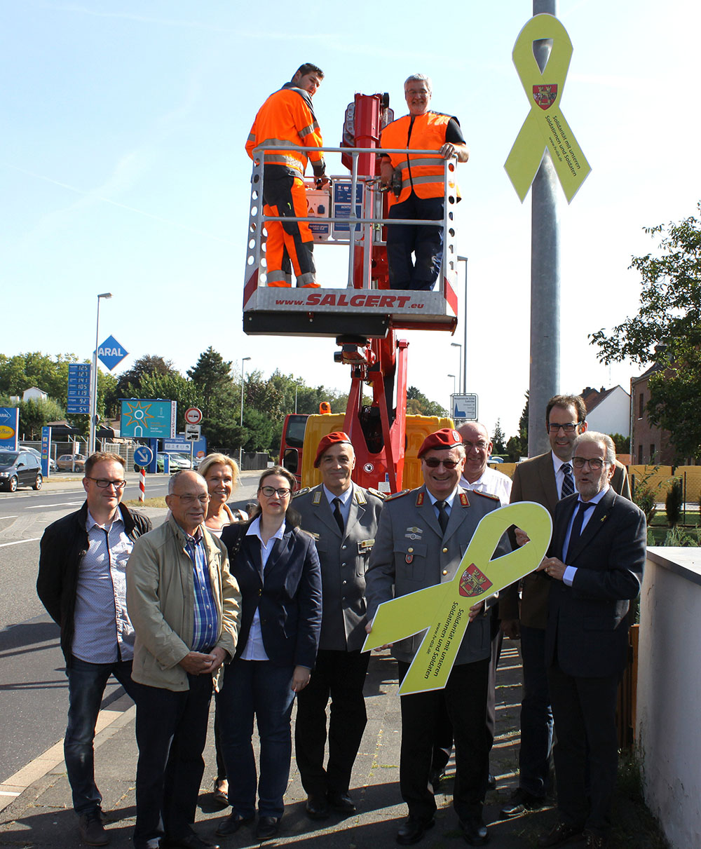 Man kennt sie eigentlich in Form einer Anstecknadel, in Euskirchen hängen die Gelben Schleifen aber nun dauerhaft als überdimensionale Varianten an den Ortseingängen, Frauenberger und Kommerner Straße. Das Zeichen für Solidarität mit den Soldatinnen und Soldaten der Bundeswehr hatten Brigadegeneral Roland Brunner und Euskirchens Bürgermeister Uwe Friedl in drei Metern Höhe an einen Laternenmast angebracht. Initiiert wurde diese Aktion von Oberstabsfeldwebel Jürgen Görlich, dem stellvertretenden Bundesvorsitzenden des Deutschen BundeswehrVerbands: Soldaten und Soldatinnen, die unter bewusstem Einsatz von Gesundheit und Leben im In- und Ausland für die Sicherheit des Landes Sorge tragen, sollen mehr gewürdigt werden. Deswegen setzt sich der DBwV-Vize für weitere Aktionen in Bundeswehrstandorten wie Mechernich oder in Zülpich ein: „Ich werde mit den Bürgermeistern sprechen, wenn sie sich nicht vorher schon melden“, erklärte Görlich. In Zülpich gebe es die Patenschaft mit dem Fliegerhorst Nörvenich. „Beide Städte sind also prädestiniert für die Gelbe Schleife“, sagte Görlich. Die „Aktion Gelbe Schleifen“ etablierte sich bereits während des Golfkriegs in den USA als Symbol für die Botschaft „support our troops“ und finden auch in Deutschland seit einigen Jahren großen Anklang, wenn es darum geht, Verbundenheit mit den Menschen der Bundeswehr zu zeigen. Die Gelbe-Schleifen-Aktion in Euskirchen aber ist in dieser Form eine Premiere.