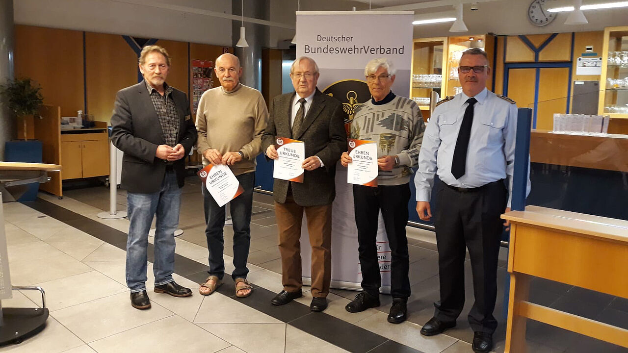 Oberstleutnant a. D. Reinhard Schlepphorst, Stabsfeldwebel a. D. Wolfgang Seipke, Oberstleutnant a. D. Gerd Hage, Stabsfeldwebel a. D. Hans Caster, Oberstabsfeldwebel a. D. Klaus Sattler. (v.l). Foto: KERH Unterer Niederrhein