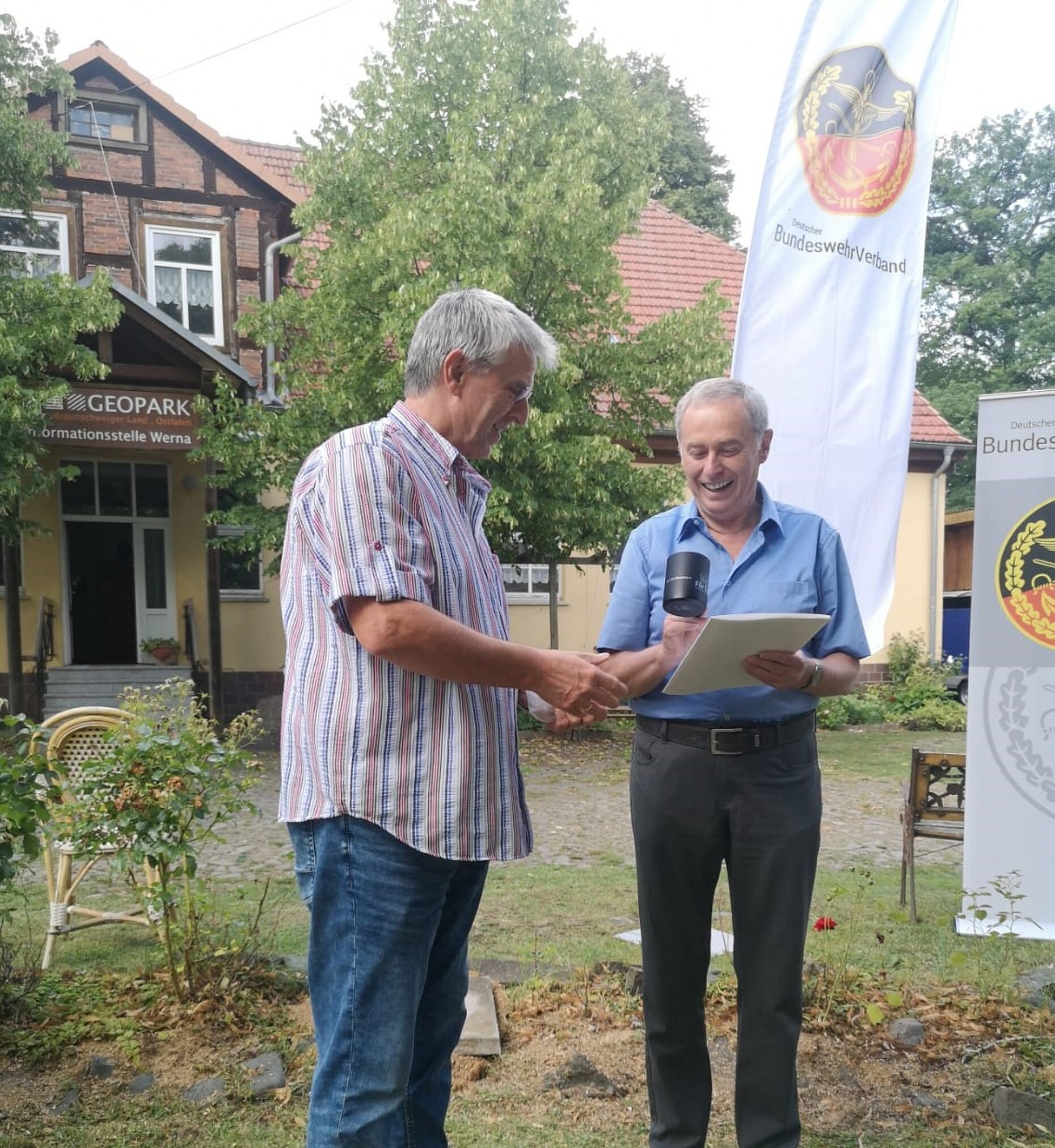 Hauptmann a. D. Hoffmann, nutzte die Gelegenheit des Sommertreffens, um Hauptmann a. D. Volker Pajo für 25 Jahre Mitgliedschaft im Deutschen BundeswehrVerband zu ehren.