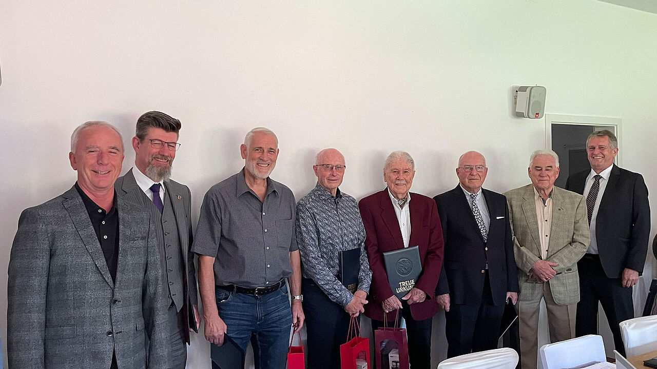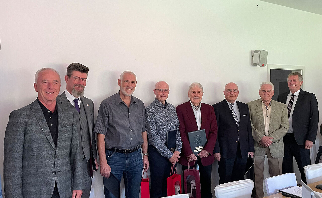 Vorsitzender Richard Fürstenberger (v.l.) mit den Geehrten Stephan Prox, Axel Schiel, Ernst Graulik, Hans-Joachim Franke, Friedrich-Karl Laabs, Theo Molderings sowie ERH-Vorsitzender Bernhard Hauber. Foto: A. Fürstenberger