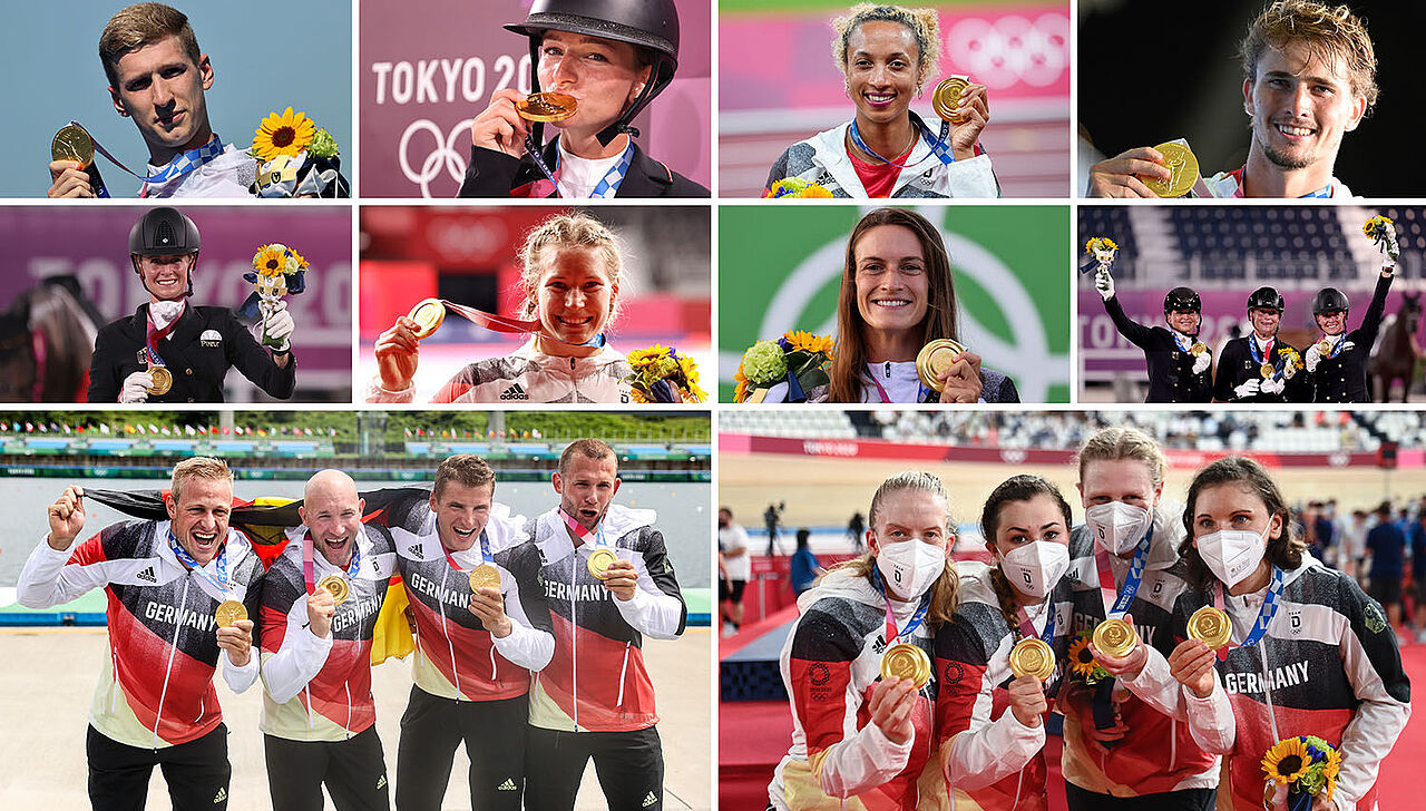 Die deutschen Goldmedaillengewinner bei den olympischen Sommerspielen in Tokio: (oben/v.l.) Florian Wellbrock (Freiwasser, 10 km), Julia Krajewski (Vielseitigkeit), Malaika Mihambo (l/Weitsprung), Alexander Zverev (Tennis); (Mitte/v.l.): Jessica von Bredow-Werndl (Dressur Einzel), Aline Rotter-Focken (Ringen), Ricarda Funk (Kanu/Slalom), Dorothee Schneider (v.l.), Isabell Werth und Jessica von Bredow-Werndl (Dressur Mannschaft); (unten/v.l.) Max Rendschmidt, Ronald Rauhe, Tom Liebscher und Max Lemke (Kajak-Vierer) und Franziska Brauße (v.l.), Lisa Klein, Mieke Kröger und Lisa Brennauer (4000m Mannschaftsverfolgung). Foto: dpa