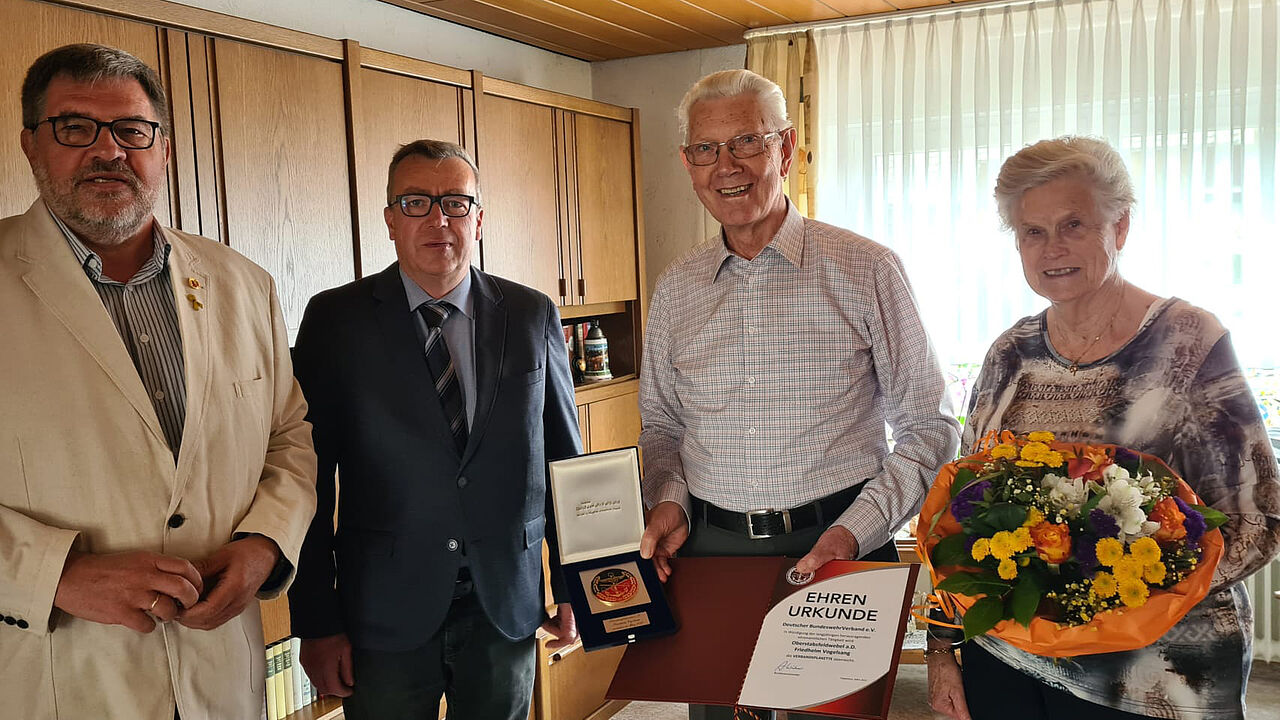 Über 27 Jahre war Oberstabsfeldwebel a.D. Friedhelm Vogelsang durchgängig als Vorsitzender der selbständigen Kameradschaft Ehemalige, Reservisten, Hinterbliebene (KERH) Paderborn im Amt. „Eigentlich sollte er zeitgleich mit der Auflösung und Neuzuordnung der Kameradschaft entsprechenden persönlichen Dank erfahren und mit der Aushändigung der DBwV-Verbandsplakette geehrt werden. Leider war dies aufgrund pandemiebedingter und persönlicher Einschränkungen lange nicht möglich“, berichtet der Vorsitzende des Bezirks Ostwestfalen-Lippe, Hauptmann a.D. Michael Killer. Nun, nach Wegfall der Hindernisse, machte sich Michael Killer auf den Weg. Gemeinsam mit dem Stellvertreter des Vorsitzenden ERH im Bundesvorstand, Hauptmann a.D. Ernst Wendland und in Begleitung der Ehefrauen stattete er dem Ehepaar Vogelsang einen Besuch ab. Und in kleiner aber „familiärer Runde“ erreichte die DBwV-Verbandsplakette nun ihren Empfänger. In seiner Laudatio würdigte der Bezirksvorsitzende die Jahrzehnte ehrenamtlichen Engagements von Friedhelm Vogelsang, der sich neben dem DBWV-Ehrenamt auch in besonders anerkennungswürdiger Weise für die Allgemeinheit engagiert hat, beispielsweise in der Betreuung für Kinder in der Pferdetherapie.