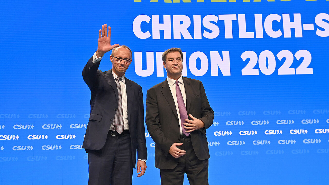 Die Parteichefs von CSU und CDU, Markus Söder (r.) und Friedrich Merz, demonstrierten auf dem Parteitag der Christsozialen in Augsburg Geschlossenheit. Foto: picture alliance / SvenSimon | Frank Hoermann/SVEN SIMON