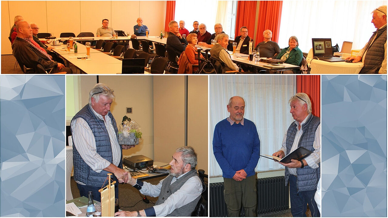 Bei der Wahlversammlung: Vorsitzender Oberstabsfeldwebel a.D. Peter Hofmann verabschiedet Stabsfeldwebel a.D. Werner Bahrke (l.u.) und ehrt Stabsfeldwebel a.D. Alfred Heun (r.u.). Foto: sKERH Pfullendorff