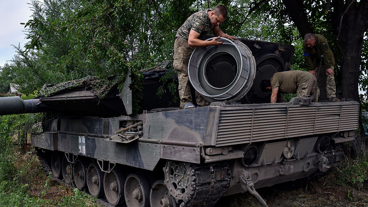 Ukrainische Soldaten arbeiten an einem Leopard 2 in der Region Saporischschja im Süden der Ukraine. Deutschland verhandelt aktuell mit Polen über die Einrichtung eines Instandsetzungszentrums für die Kampfpanzer in Polen. Foto: picture alliance/ASSOCIATED PRESS/Andriy Andriyenko