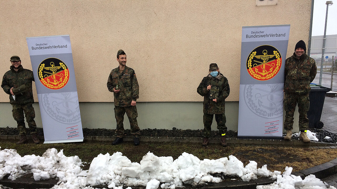 Durch ihre Teilnahme in doppeltem Sinn gewonnen haben: Hauptfeldwebel Hendrik Peters, Oberstabsgefreiter Edgar Stiglitz und Oberfeldwebel Nina Henke (v.l.) mit dem TruKa-Vorsitzenden SanRgt 2, Stabsfeldwebel Randy Albrecht (nicht auf dem Bild die Hauptfeldwebel Andreas Klassen und Hanna Kasperski).Foto: C. Etz