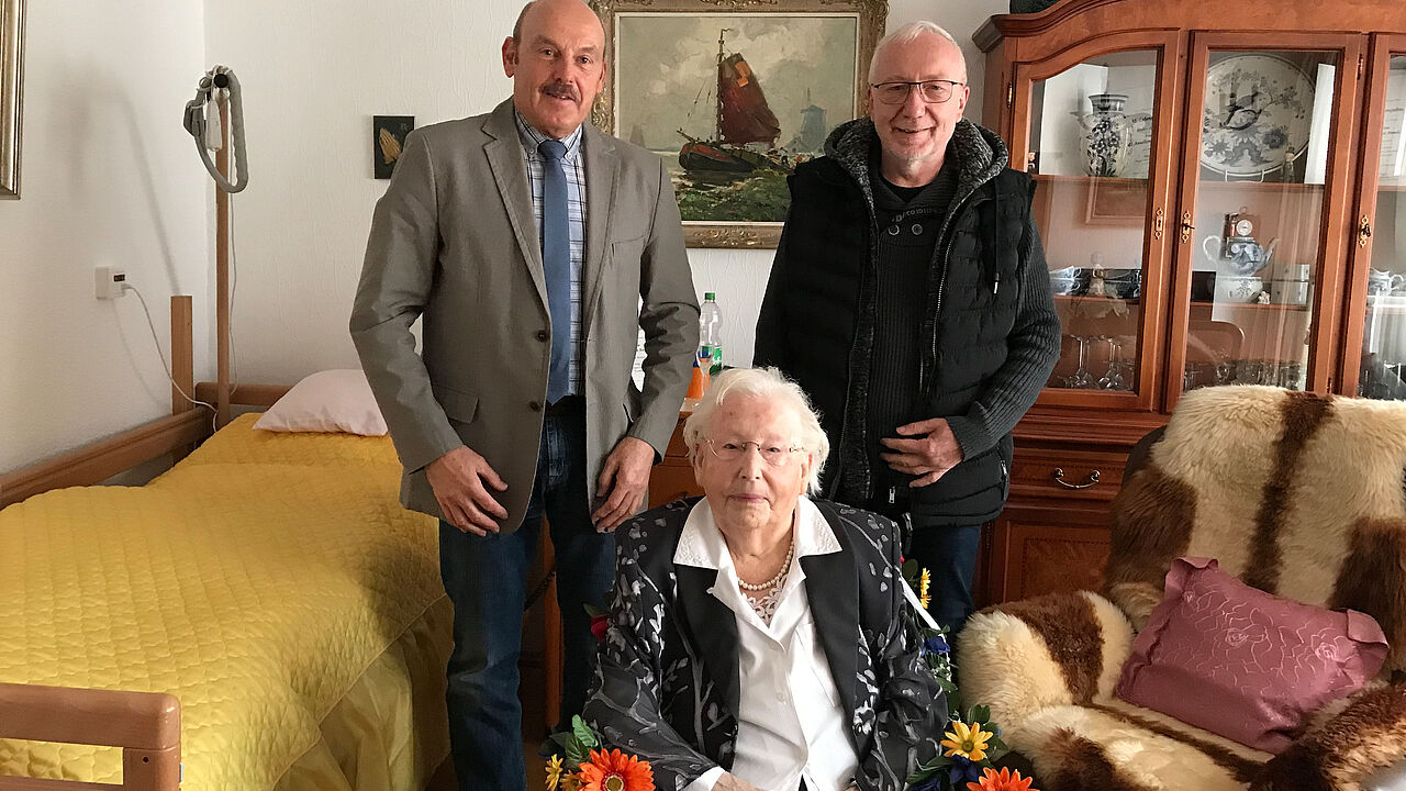 Wohl eines der ältesten Mitglieder im Landesverband West ist Anneliese Arendt – in ihrer Kameradschaft der Ehemaligen Reservisten und Hinterbliebenen (KERH) Ruhrgebiet ist sie es gewiss! Den 100. Geburtstag der alten Dame nahmen der stellvertretende Vorsitzende der KERH Ruhrgebiet, Stabsfeldwebel a.D. Martin Kleinschnieder, und der Schriftführer Hauptmann a.D. Lothar Kopczacki zum Anlass für einen Besuch. Bewaffnet mit einem Blumenstrauß und einem persönlichen Brief des Bundesvorsitzenden, Oberstleutnant André Wüstner, überraschten die beiden Frau Arendt.