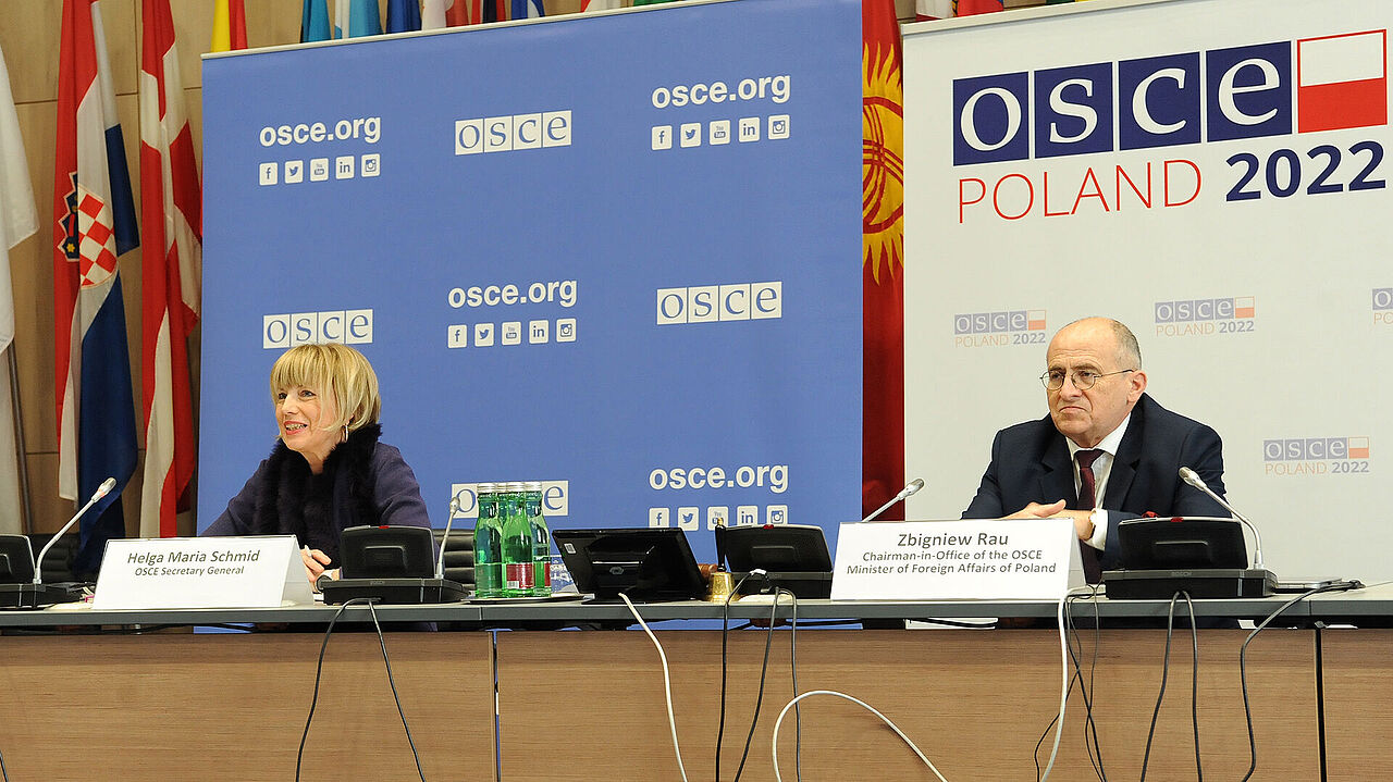Nach den Verhandlungen in Wien: OSZE-Generalsekretärin Helga Maria Schmid und Polens Außenminister Zbigniew Rau. Foto: OSZE