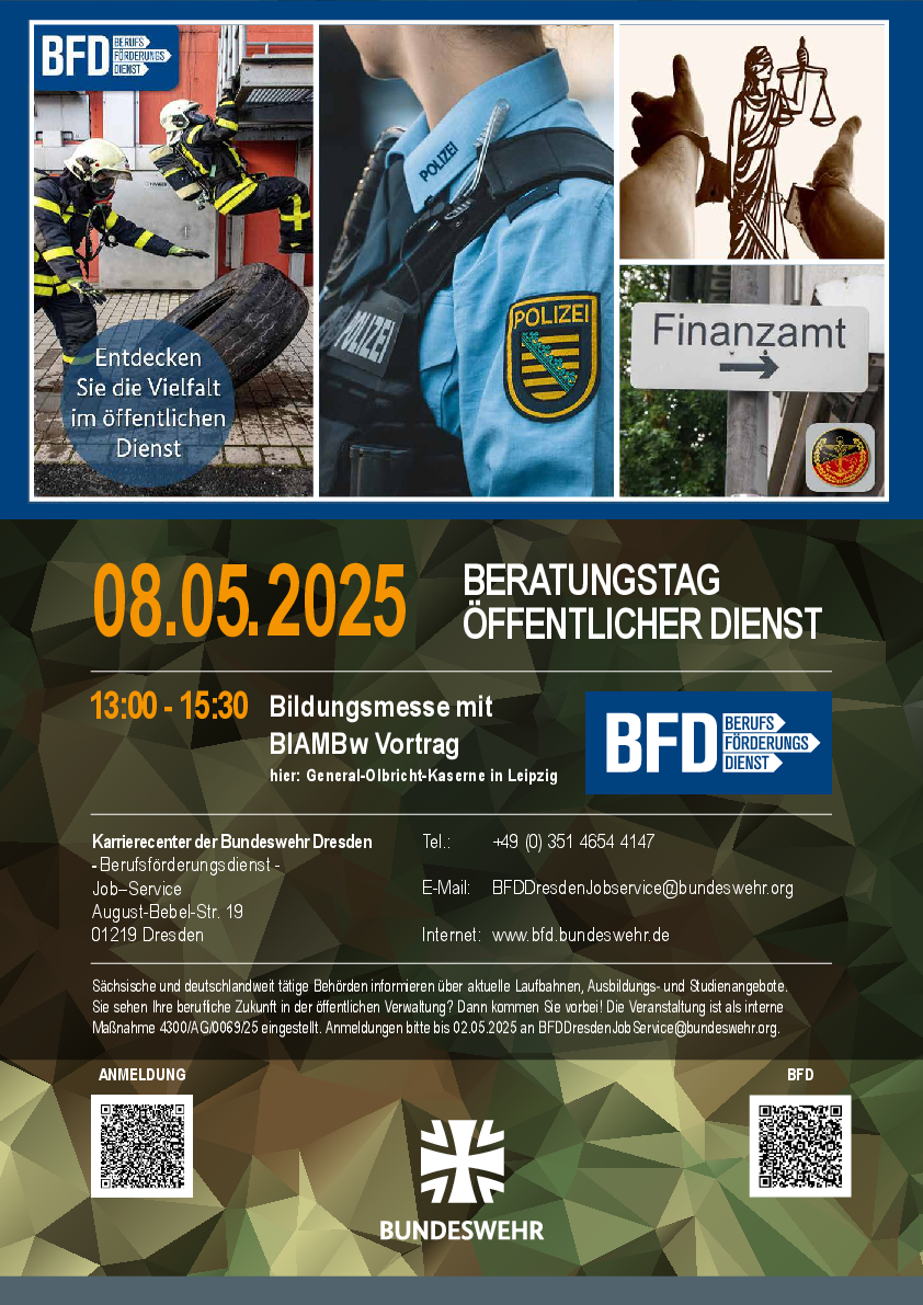 Karrierecenter der Bundeswehr Dresden Frau Wiechert, Telefon extern: +49 (0)351 4654 4147, Telefon intern: 90 8911 4147 E-Mail: BFDDresdenJobservice@bundeswehr.org