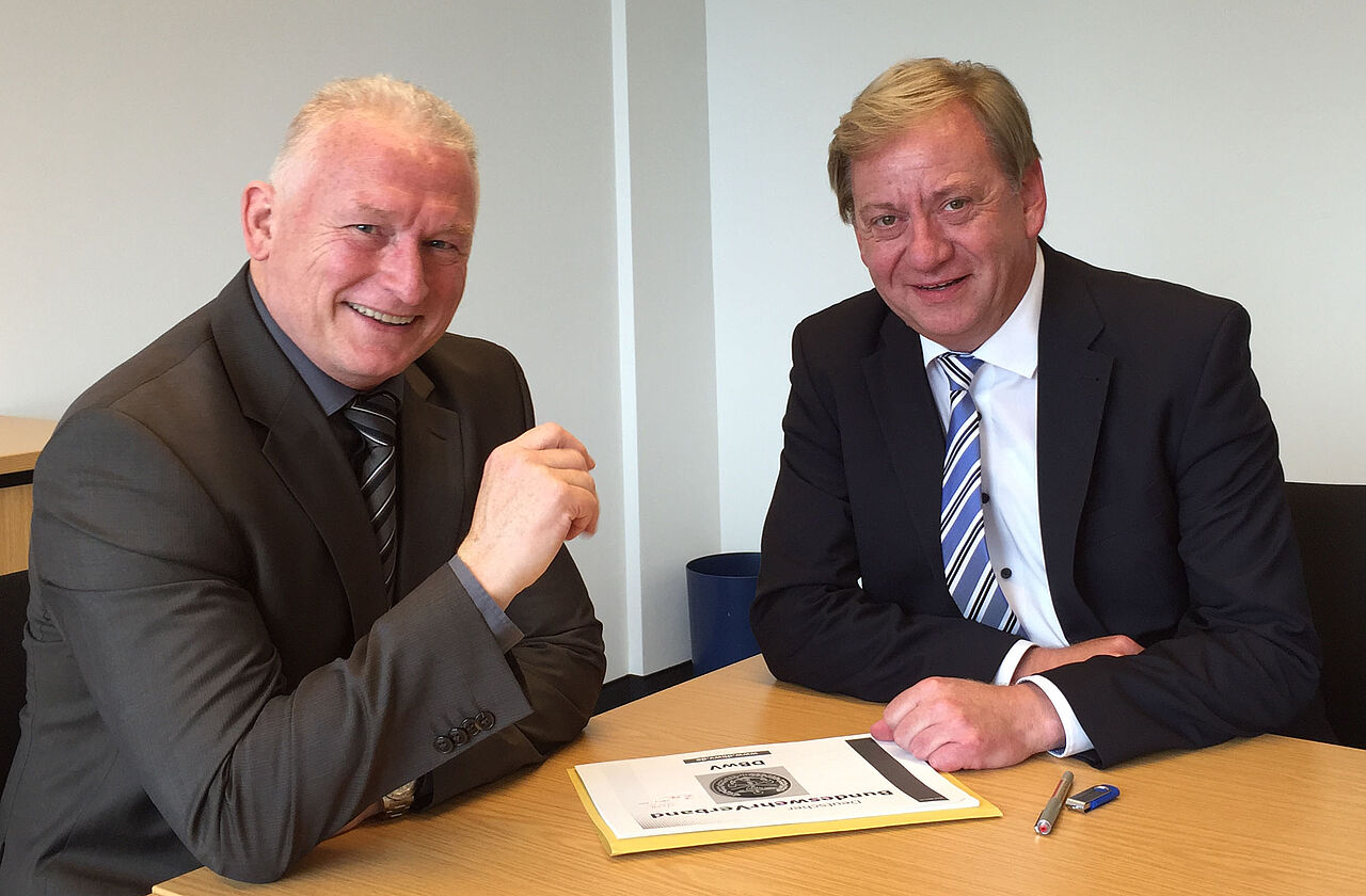 Andreas Hubert, Vorsitzender Fachbereich Beteiligungsrechte, im Gespräch mit Ingo Gädechens (r.), Mitglied des Verteidigungsausschusses des Deutschen Bundestages und Berichterstatter zum Thema "Mitarbeitervertretung" der CDU-Bundestagsfraktion. Foto: DBwV