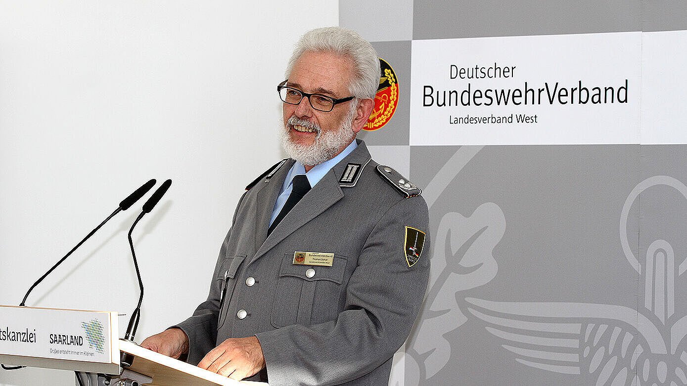 Oberst Klaus Peter Schirra, Kommandeur Landeskommando Saarland, reflektierte in seinem Grußwort die Einzigartigkeit des Bundeswehrverbandes, dem er selbst seit Jahrzehnten angehört, als erste demokratische Interessenvertretung in der deutschen Militärgeschichte. "Was vor allem zählt ist, dass der Bundeswehrverband sich für unsere Interessen, die Interessen aller Angehörigen der Streitkräfte vehement, fundiert, kritisch und ohne Rücksicht auf Dienstgrad- oder Statusgruppen einsetzt. Er ist heute unsere Stimme in Berlin beim Bundestag und bei der Bundesregierung, weil er an der Vorbereitung aller gesetzlichen Regelungen, die die Bundeswehr betreffen, beteiligt wird. Diese demokratischen Beteiligungsrechte sind, wenn ich richtig informiert bin, auch einzigartig in der Welt und darauf können wir alle gemeinsam durchaus stolz sein." so der Stabsoffizier in seinem Grußwort.