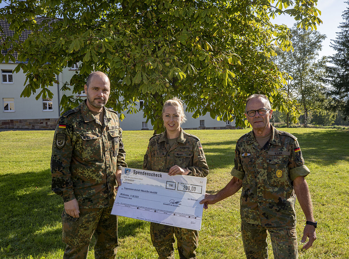Den Spendenscheck von 200 Euro übergaben die beim Projekt für Ausbildung und Organisation zuständigen Stabsfeldwebel Stefan Dahlke und Wolfgang Illek an die Vorsitzende der TruKa VNAusbZBw InAusb SKB, Stabsunteroffizier (FA) Sandra Amberg.