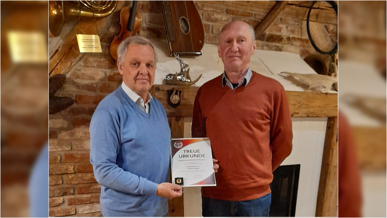 Bei der Vorstandssitzung am 21.02.2024 zeichnete Vorsitzender Stabsfeldwebel a.D. Ludwig Birngruber seinen Stellvertreter Hauptmann a.D. Günter Diebel mit der Treueurkunde und der Treuenadel aus.
