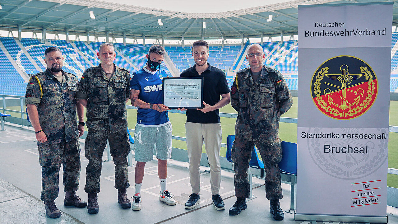 Die Mitwirkenden bei der Spendenaktion zugunsten des Kinderhospiz Karlsruhe: Stellvertreter Oberstabsfeldwebel Marco Somma, Heimfeldwebel Stabsfeldwebel Hofheinz, TikToker TiSe, Max Ganter vom KSC und StoKa-Vorsitzender Oberstabsfeldwebel Heiko Steng. Foto: Heiko Steng