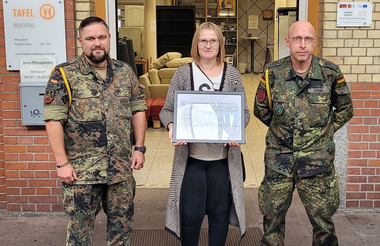 Am 25. September 2024 übergaben TruKa-Vorsitzender Oberstabsfeldwebel Heiko Steng und sein Stellvertreter Oberstabsfeldwebel Marco Somma die beim Oktoberfest in der General Dr. Speidel- Kaserne gesammelte Spende in Höhe von 770 Euro an die Tafel Bruchsal.