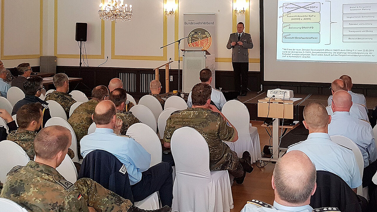 Einen breiten Raum nahm der Vortrag mit Aussprache zur "Trendwende Personal – Aktuelles aus der Personalführung" von Oberstleutnant Ralph Schmidt ein. Der Referent des Bundesamtes für Personalmanagement der Bundeswehr (BAPersBw) sprach die vielschichtigen Herausforderungen der Personalentwicklung an. Schmidt machte die Arbeitsweise im BAPersBw transparent. Er stellte in Ergänzung zum bekannten Konferenzsystem die neu eingeführte kontinuierliche Potentialbetrachtung der Unteroffiziere mit Portepee für die Personalauswahl von Spitzendienstposten vor. Schmidt zeigte sich trotz aller Herausforderungen optimistisch über die Personalentwicklung in der Bundeswehr.