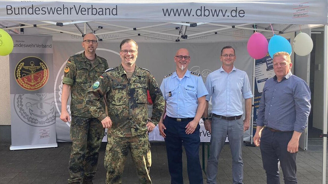 Zur Unterstützung der TruKa Tempelhof hatten sich einige ehrenamtliche Mandatsträger und hauptamtliche Mitarbeiter unter Führung des Bezirksvorsitzenden Berlin/Brandenburg, Hauptmann Christian Weber (1.v.l.) bereit erklärt, den Informationsstand beim Familienfest der TruKa Tempelhof zu betreiben und damit dem Vorsitzenden der TruKa Stabsfeldwebel Markus Taulin (2.v.l.) die nötigen Freiräume zu schaffen, selbst feiern zu können. Foto: Christian Weber