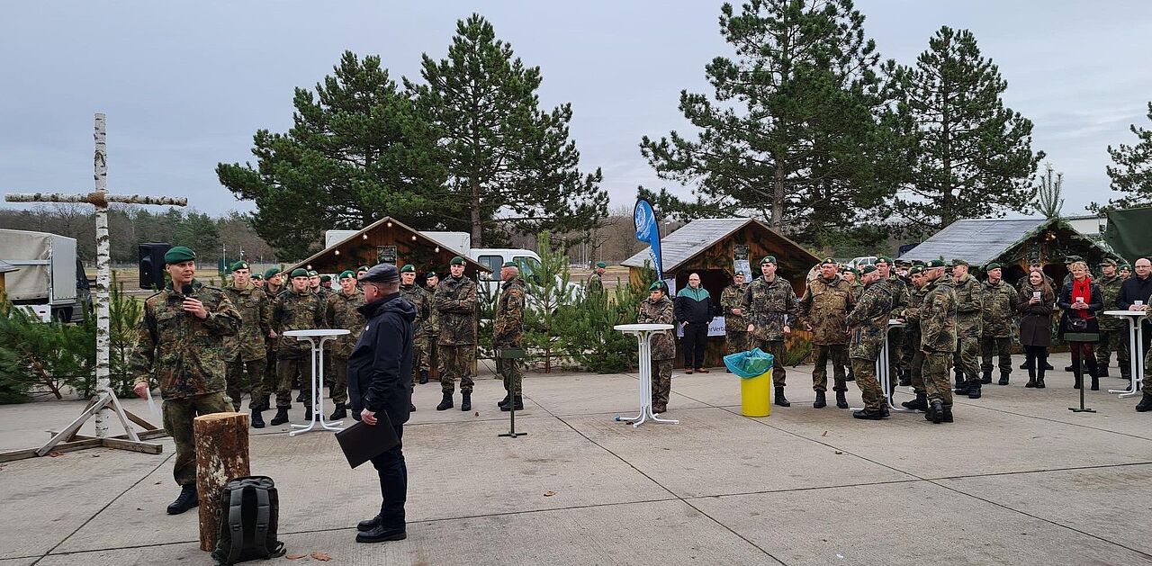 Sieben Dienststellen – sieben Stände beim Standortweihnachtsmarkt boten im Dezember 2025 einen schönen Rahmen, um etwas innehalten zu können und auf ein forderndes Jahr 2025 zurückzublicken. Genau dies tat auch der Kommandeur des Jägerbataillon 413, Oberstleutnant Joachim Ruthe in seiner Eröffnungsansprache, in der er sich auch bei allen Organisatoren für die Vorbereitung und die Durchführung des Weihnachtsmarktes herzlich bedankte. Im Anschluss nutzte dann der evangelische Standortpfarrer Jörg Adomat die Möglichkeit in einer erfrischenden Predigt über die Weihnachtzeit an sich, den Weihnachtsmann als Tradition sowie der Adventszeit als Vorbereitung auf Weihnachten zu sprechen.