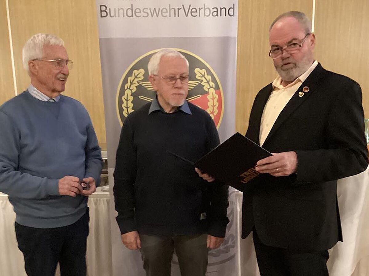 Oberstabsfeldwebel a.D. Heinz-Georg Arends (Schriftführer), der Jubilar Manfred Johnke und der Vorsitzende Peter Pfaff (v.l.) Foto: DBwV