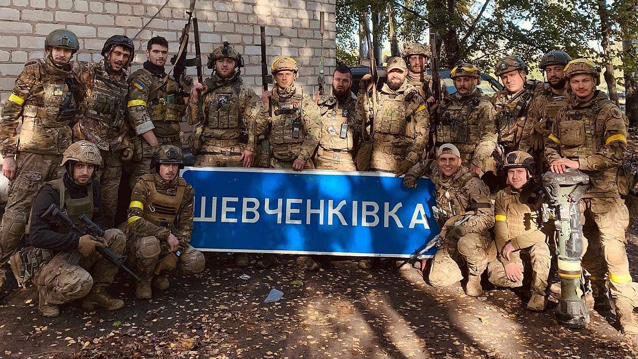 Ukrainische Soldaten, nachdem sie die Ortschaft Schevchenkivka im Oblast Cherson befreit haben. Foto: Twitter/Ukrainische Streitkräfte
