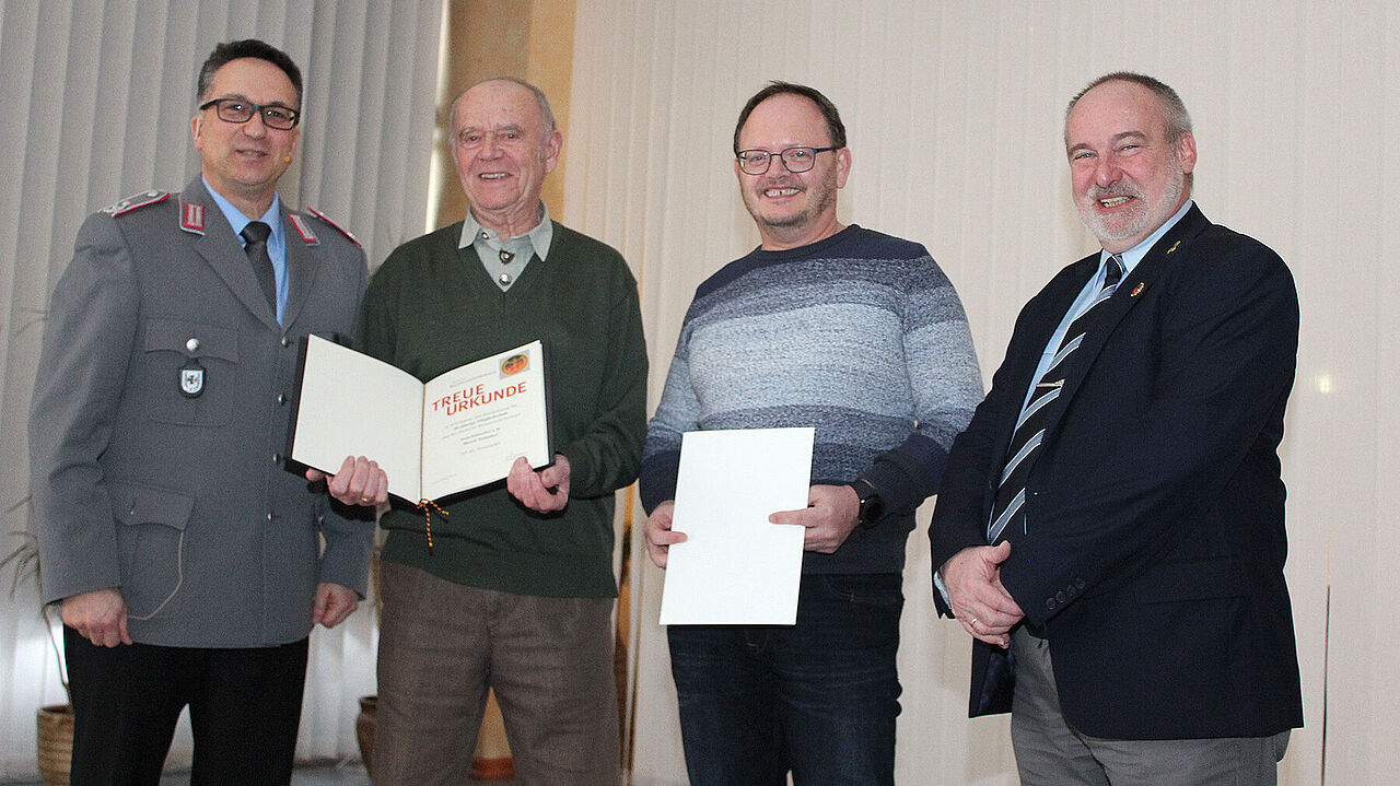 Dabei informierte er die DBwV-Mitglieder auch zu den derzeitigen Schwerpunkten der verbandspolitischen Arbeit. Bevor man zum gemütlichen Teil bei Kaffee und Kuchen überging, würdigten Schwab und Müller noch zwei langjährige Verbandsmitglieder. Für ihre 40 bzw. 50 jährige Mitgliedschaft wurden Hauptmann a.D. Peter Görtz und Stabsfeldwebel a.D. Horst Sommer die Treueurkunde und Nadel überreicht. „Besonderer Dank gilt auch Oberstabsfeldwebel a.D. Willibald Seitz und Stabsfeldwebel a.D. Helmut Westphal“ betont Vorsitzender Müller. „Die beiden haben -wie gehabt- den unterhaltsamen Part während dem gemütlichen Miteinander übernommen“. Bei der hierbei durchgeführten Spendenaktion wurden 160 Euro gesammelt, die über die Soldaten und Veteranen Stiftung (SVS) hilfsbedürftigen Menschen in der Bundeswehr zugute kommen.