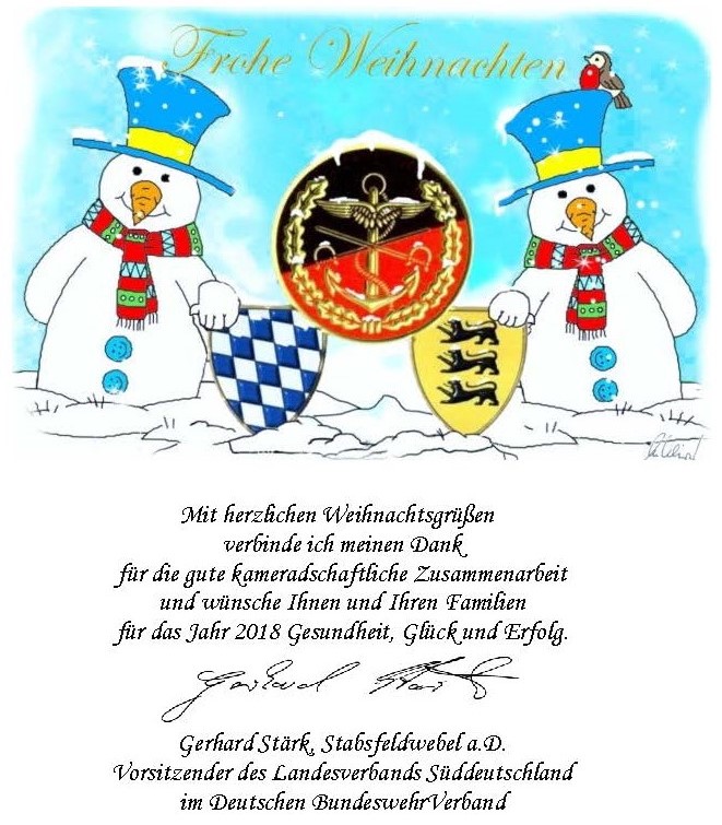 Das neue Jahr wird nicht weniger arbeitsintensiv werden. Neben dem bewährten Tagungs-/Veranstaltungsangebot stehen die Neuwahlen in den Kameradschaften mit den anschließenden Landestagungen auf Ebene der Bezirke sowie der Kameradschaften der ERH auf dem Programm. Der Landesvorsitzende Stabsfeldwebel a.D. Gerhard Stärk bedankt sich bei allen Mitgliedern des Landesverbands Süddeutschland für das ehrenamtliche Engagement im Deutschen BundeswehrVerband mit den besten Wünschen für das Weihnachtsfest und das neue Jahr 2018.