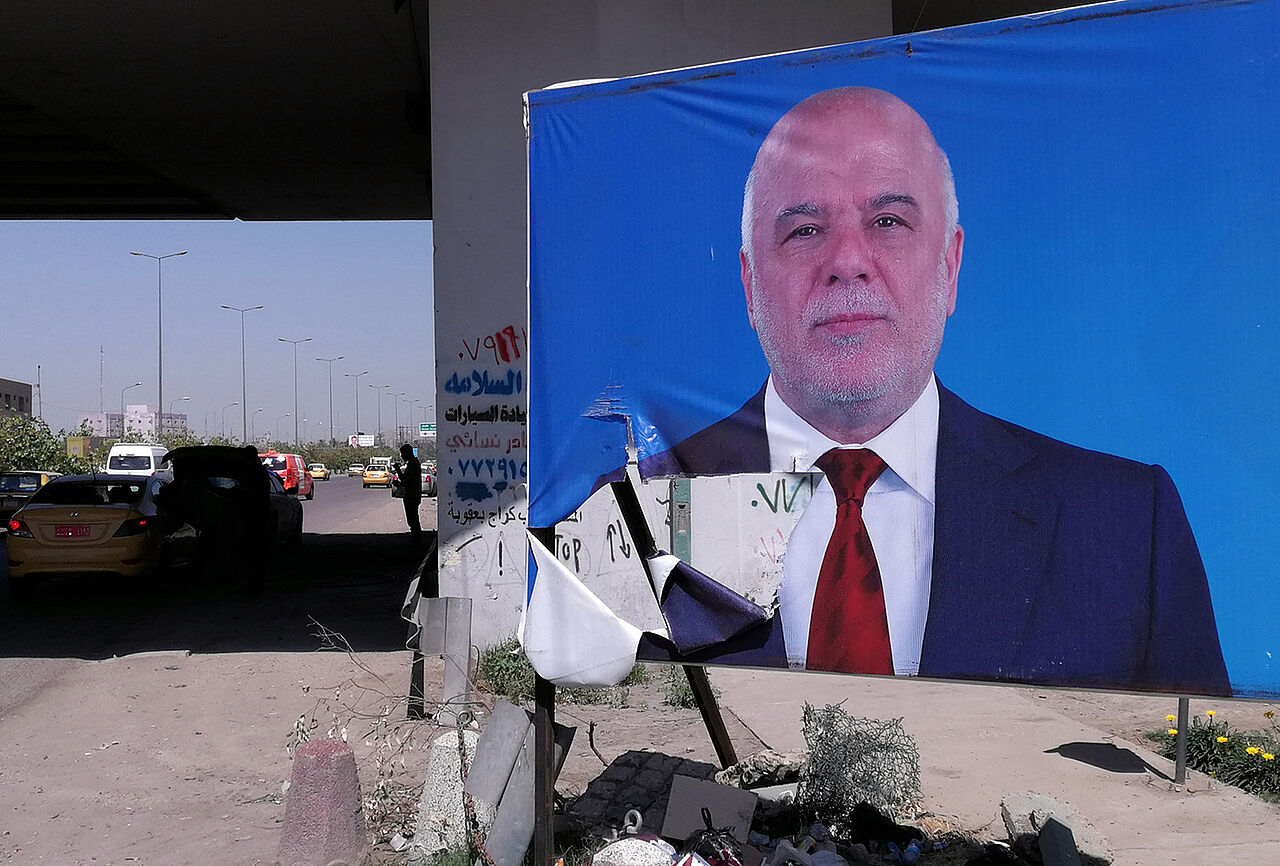 Iraks Premierminister Haidar al-Abadi auf einem Wahlplakat in Bagdad. Der Amtshinhaber muss ersten Auszählungen zufolge um seine Macht fürchten Foto: dpa