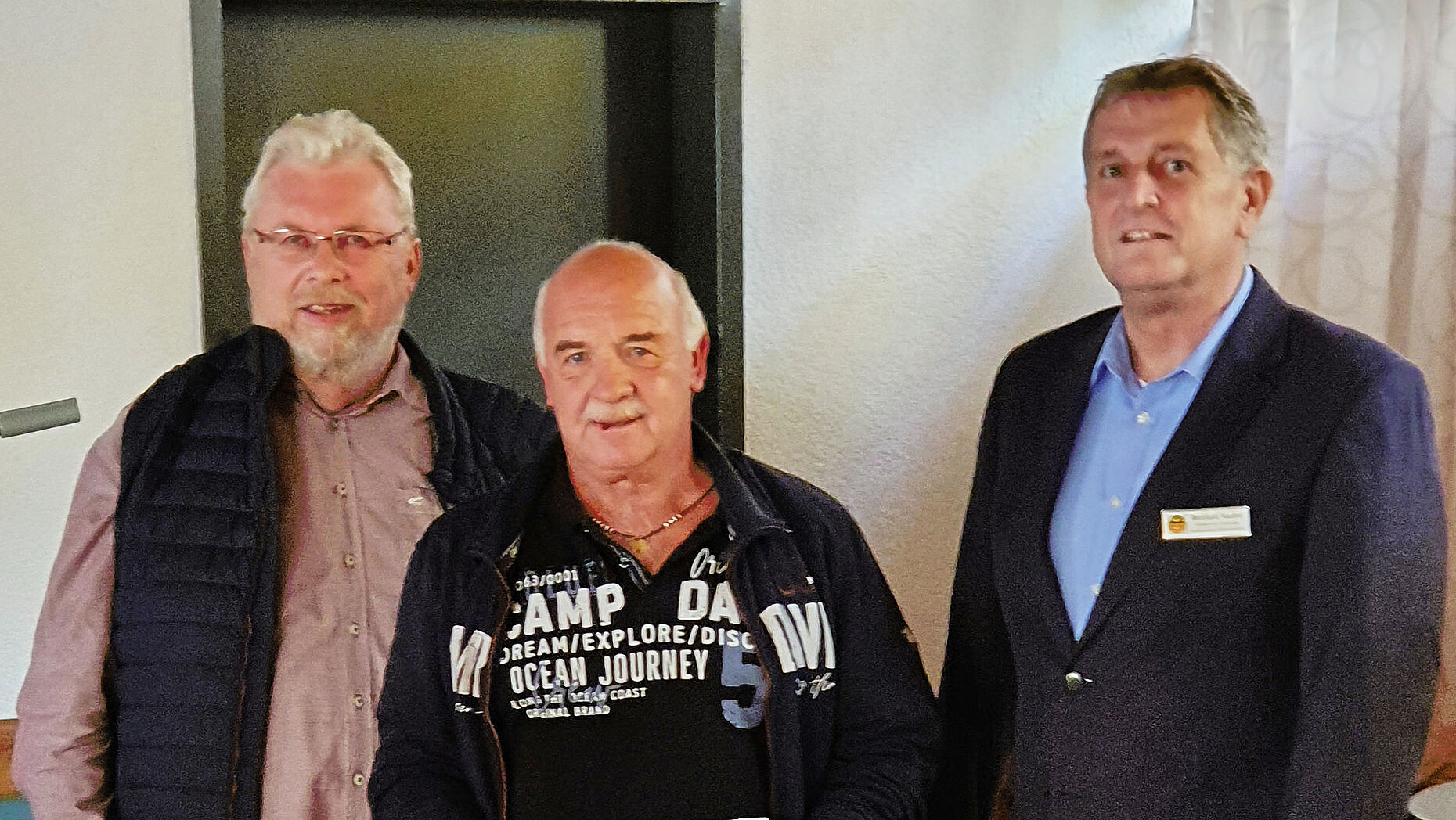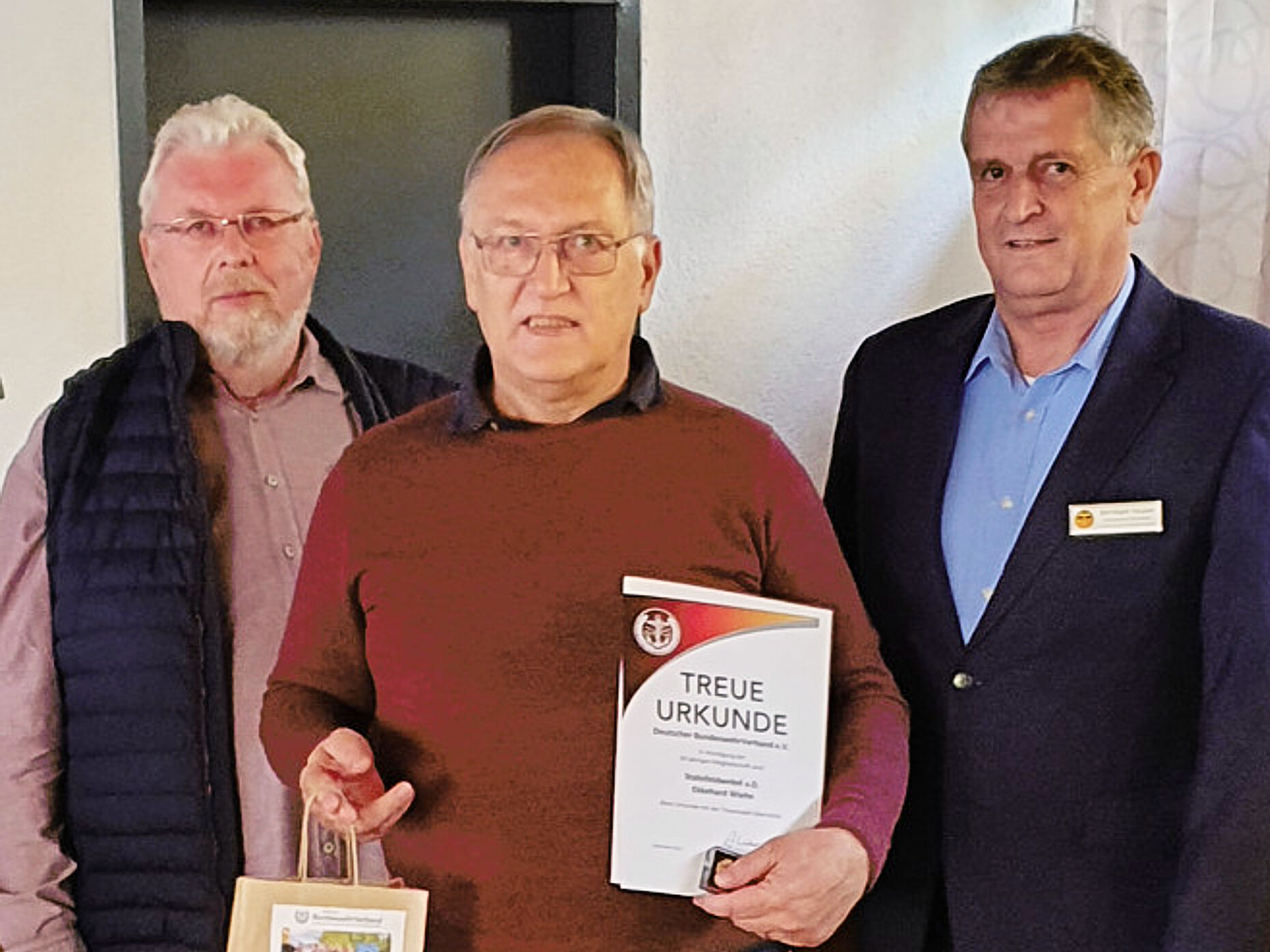 Die Vorsitzenden Hauber und Schneider würdigten den herausragenden Einsatz von zwei Mitgliedern der Kameradschaft. Mehr als fünfzig Jahre, damit fast sein halbes Leben, ist Stabsfeldwebel a.D. Ekkehard Wiehn Mitglied im DBwV. Seit vielen Jahren ist er stellvertretender Vorsitzender der Kameradschaft ERH und war eine Zeit lang auch Vorsitzender der hiesigen Standortkameradschaft. Auf über 40 Jahre Mitgliedschaft bringt es Stabsfeldwebel a.D. Roland Wölpper, der sich seit vielen Jahren in der Kameradschaft bei der Organisation von Veranstaltungen einbringt. Wiehn und Wölpper erhielten Treueurkunden und -nadeln.