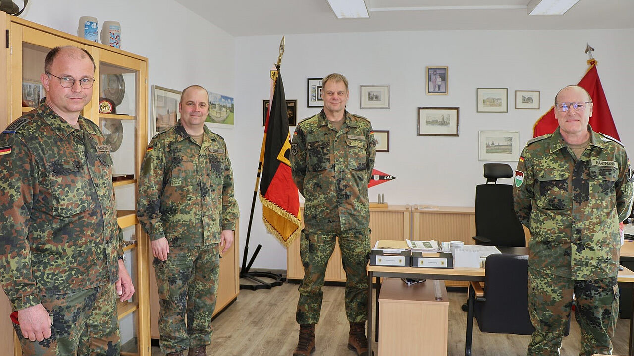 Der Stellvertretende Vorsitzender Heer, Oberstabsfeldwebel Frank Heidemann (v.l.) und der Vorsitzende Heer Oberstleutnant Robert Thiele beim Kommandeur der Divisionstruppen, Brigadegeneral Michael Podzus, mit dem Bezirksvorsitzenden, Hauptmann Oliver Hartmann. Foto: Karsten Dyba