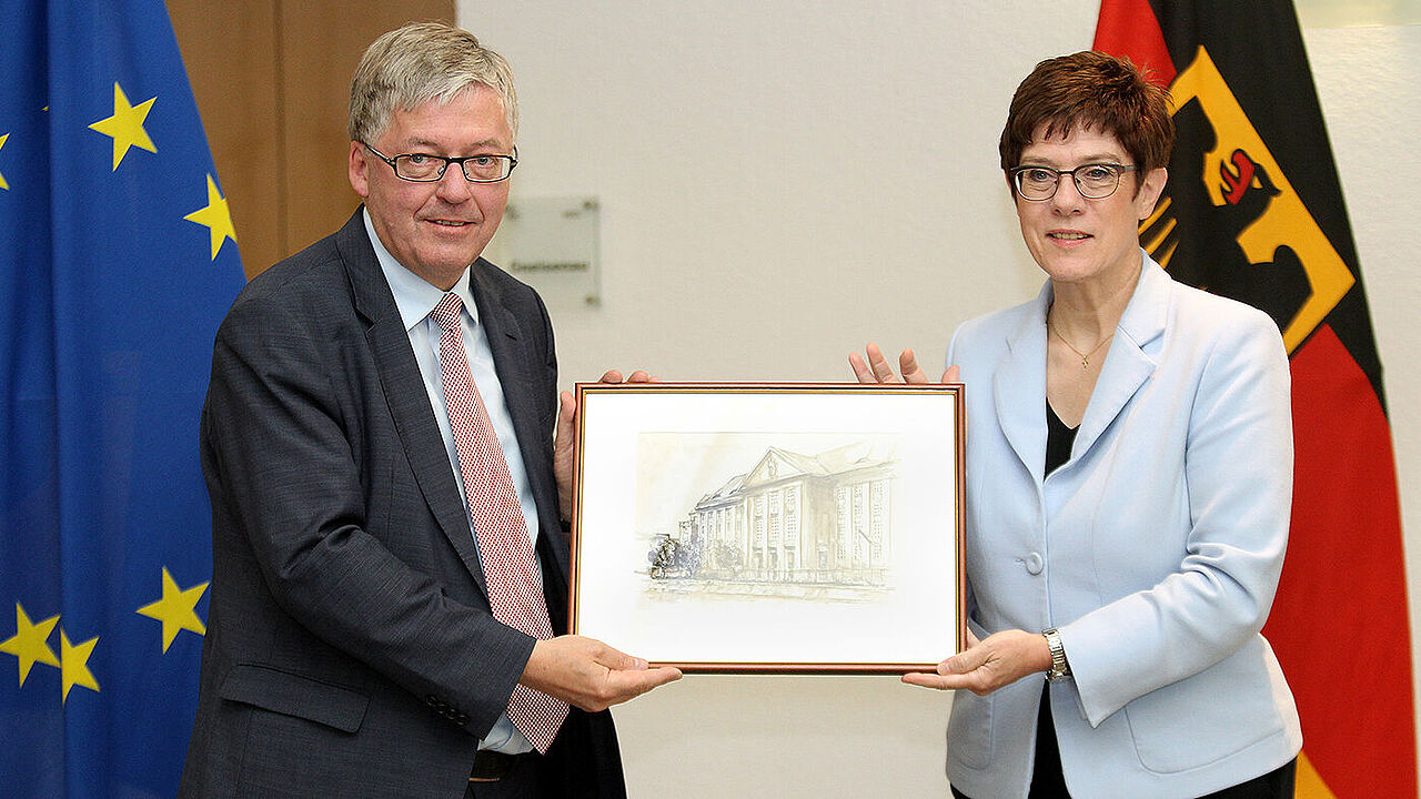 Berlin. Die Bundesministerin der Verteidigung, Annegret Kramp-Karrenbauer, hat heute (18. Mai) den zwölften Wehrbeauftragten des Deutschen Bundestages, Hans-Peter Bartels, aus seinem Amt verabschiedet. Sie ehrte ihn mit einem kleinen Festakt im Gästekasino des Bendlerblocks in Berlin, dem zweiten Dienstsitz des Bundesministeriums der Verteidigung. Zu den Gästen gehörte auch der DBwV-Bundesvorsitzende Oberstleutnant André Wüstner.