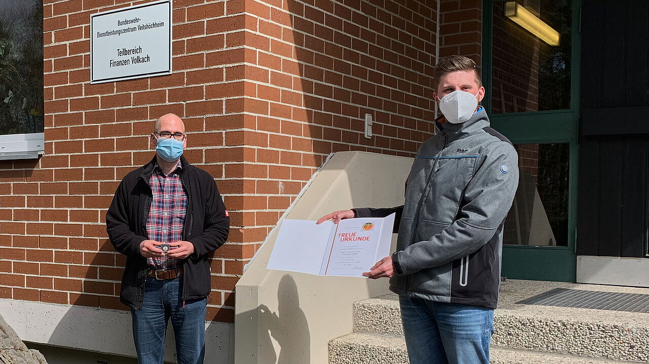 Vorsitzender Hauptbootsmann Nick Oertel (r.) überreicht Thorsten Stößel Treuenadel und -urkunde. Foto: sTruKa Mainfranken-Kaserne Volkach