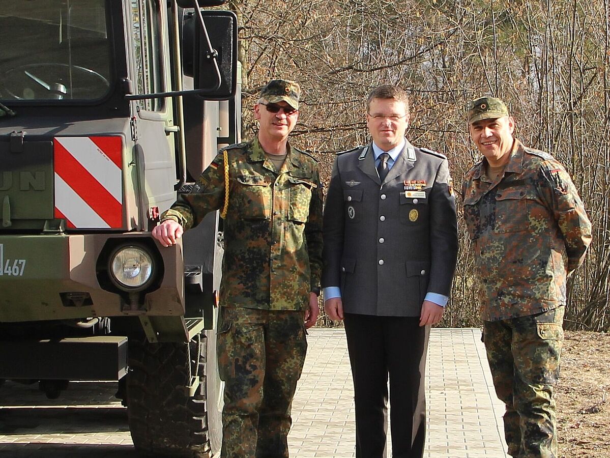 Oberstleutnant Patrick Dohmen begrüßt den Bundesvorsitzenden mit Oberstabsfeldwebel Stefan Weyer am Symbol des „Elefantenbataillons“ (v.l.) Foto: DBwV