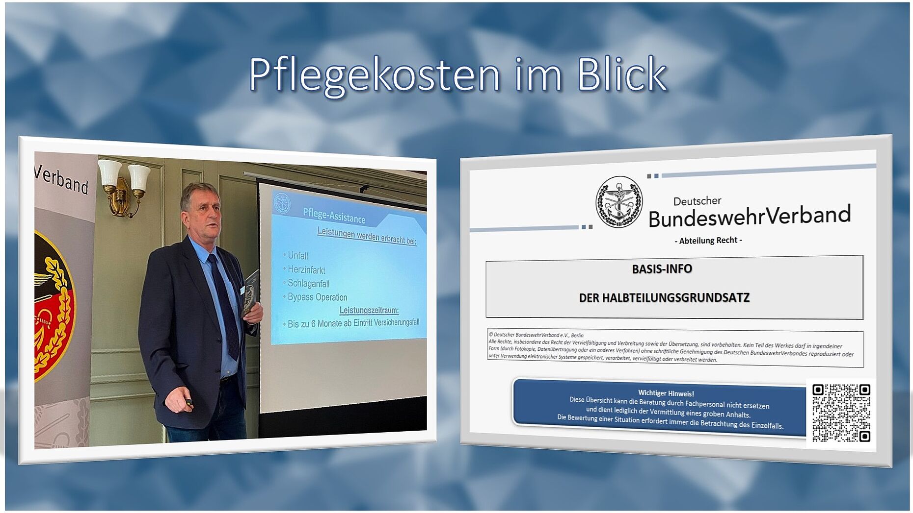 Gesetzlich in der Pflegeversicherung versicherte Witwen sollte bewusst sein, dass Sie vom beihilfeberechtigten Ehepartner dessen „Beihilfeanspruch“ mit Beginn der Hinterbliebenenversorgung erben. Bei der Erstattung der Pflegekosten gelte deshalb beim Zusammentreffen von Witwenrente und gesetzlicher Rente der Halbteilungsgrundsatz. Für die meisten war dies eine ganz neue und wichtige Information. Der DBwV hat dazu eine aktuelle „Basis – Info: Der Halbteilungsgrundsatz“ vom März 2023 in der Community bereitgestellt. Bei weiterem individuellen Informationsbedarf ist das Versorgungsreferat Beratung unter Telefon 030-259260-2222 oder per Mail: R1@dbwv.de zu erreichen.